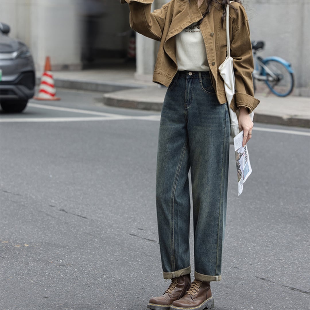 カジュアルでありながら、ノスタルジックな印象を与えるブルーストレートデニムパンツ。