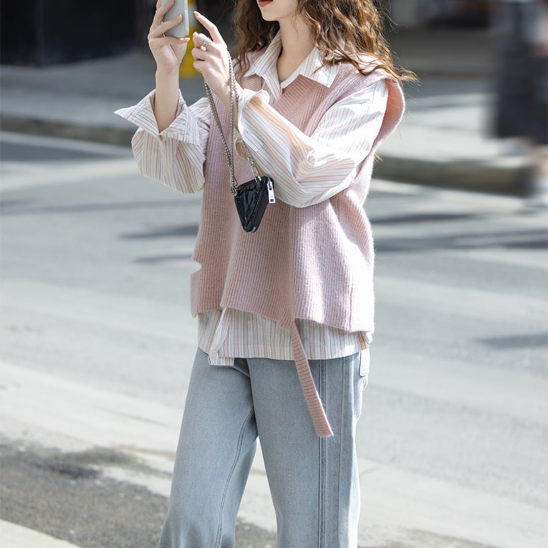 カジュアルでありながら、柔らかな色合いが魅力の優しいピンクのルーズニットVネックベスト。リラックスしたフィット感とトレンドを押さえたデザインが特徴で、どんなコーディネートにもスムーズに馴染みます◎