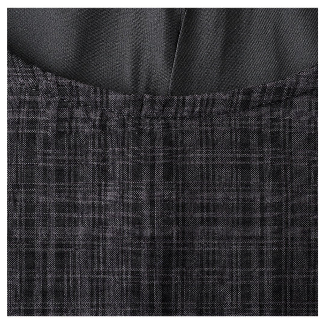 チェック柄を取り入れたゆったりとしたデザイン、ラウンドネックのノースリーブワンピースは、快適さとスタイルを両立させた一着です。