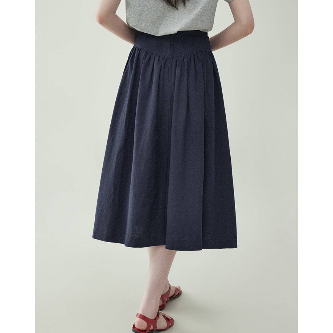 落ち着いたネイビーカラーと上品なフレアシルエットが魅力のミモレ丈スカート。