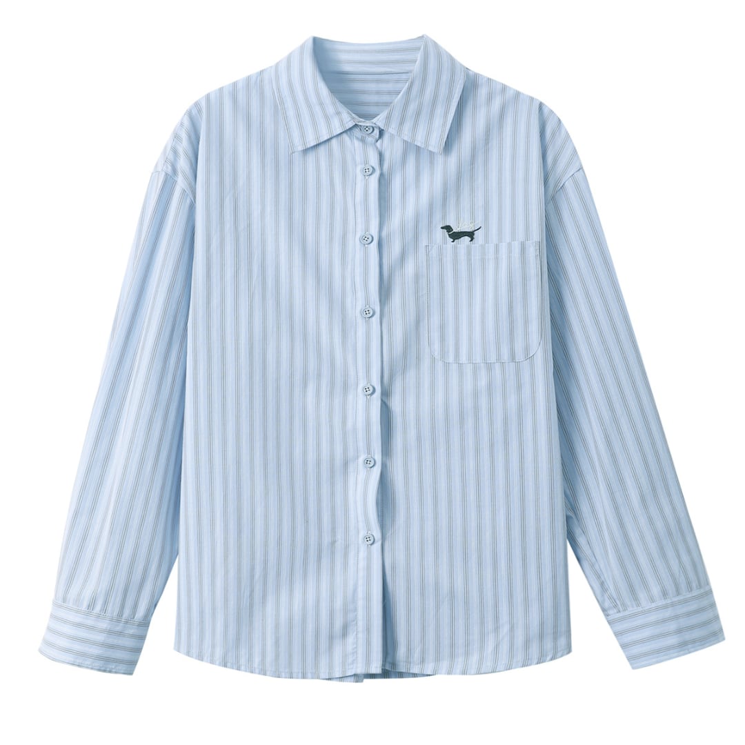 細かなストライプに胸元の刺繍モチーフが映える、上品な雰囲気の長袖シャツ。