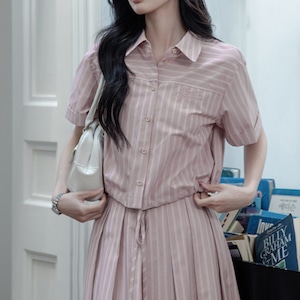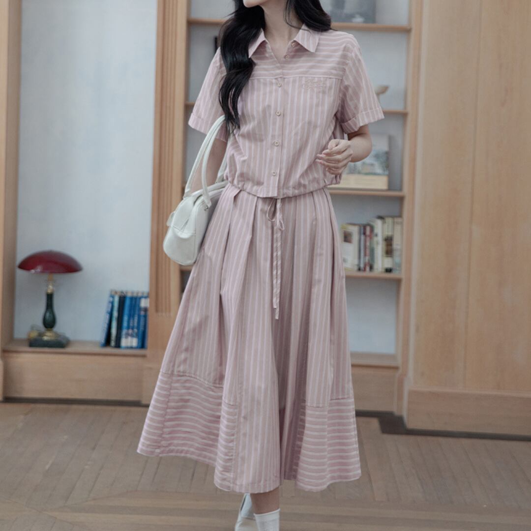 ストライプ柄とロゴ刺繍が上品にマッチした、ゆったりシルエットの半袖シャツ。
