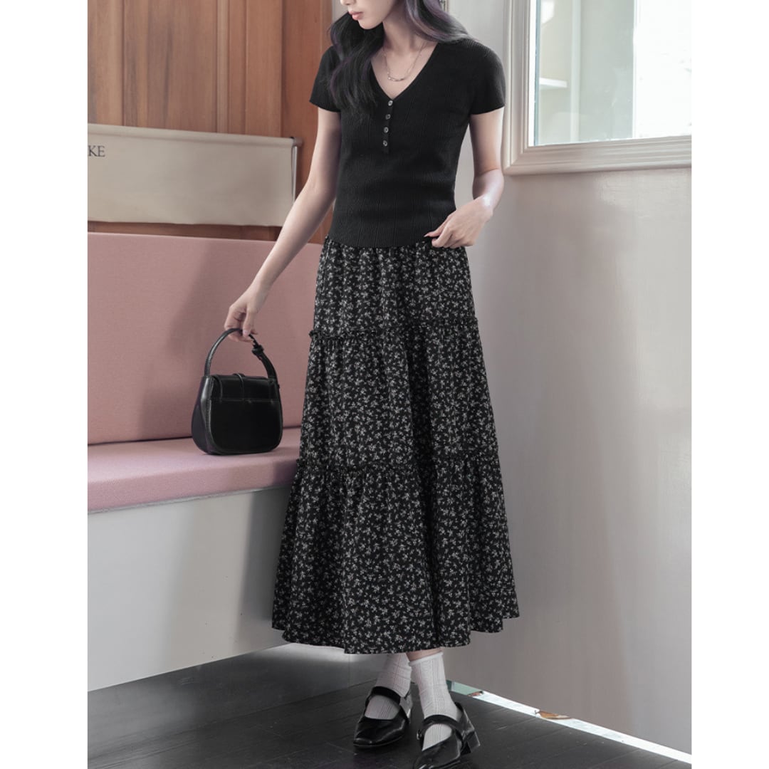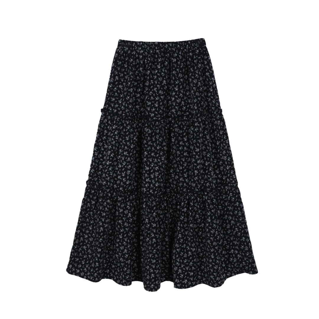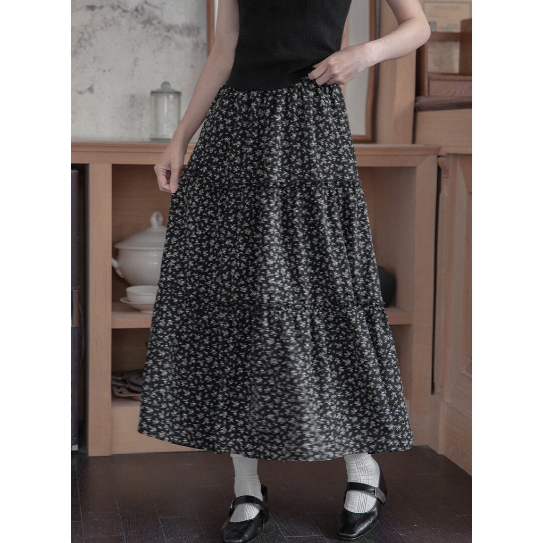 小花柄プリントが愛らしい印象を与える、ティアードデザインのAラインスカート。