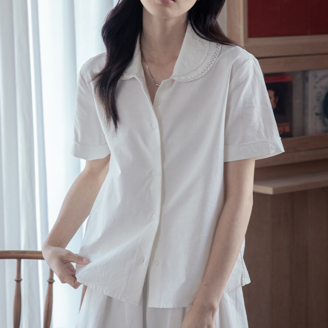 立体感のある刺繍と丸みを帯びた襟が目を引く、クラシカルな印象の半袖ブラウス。