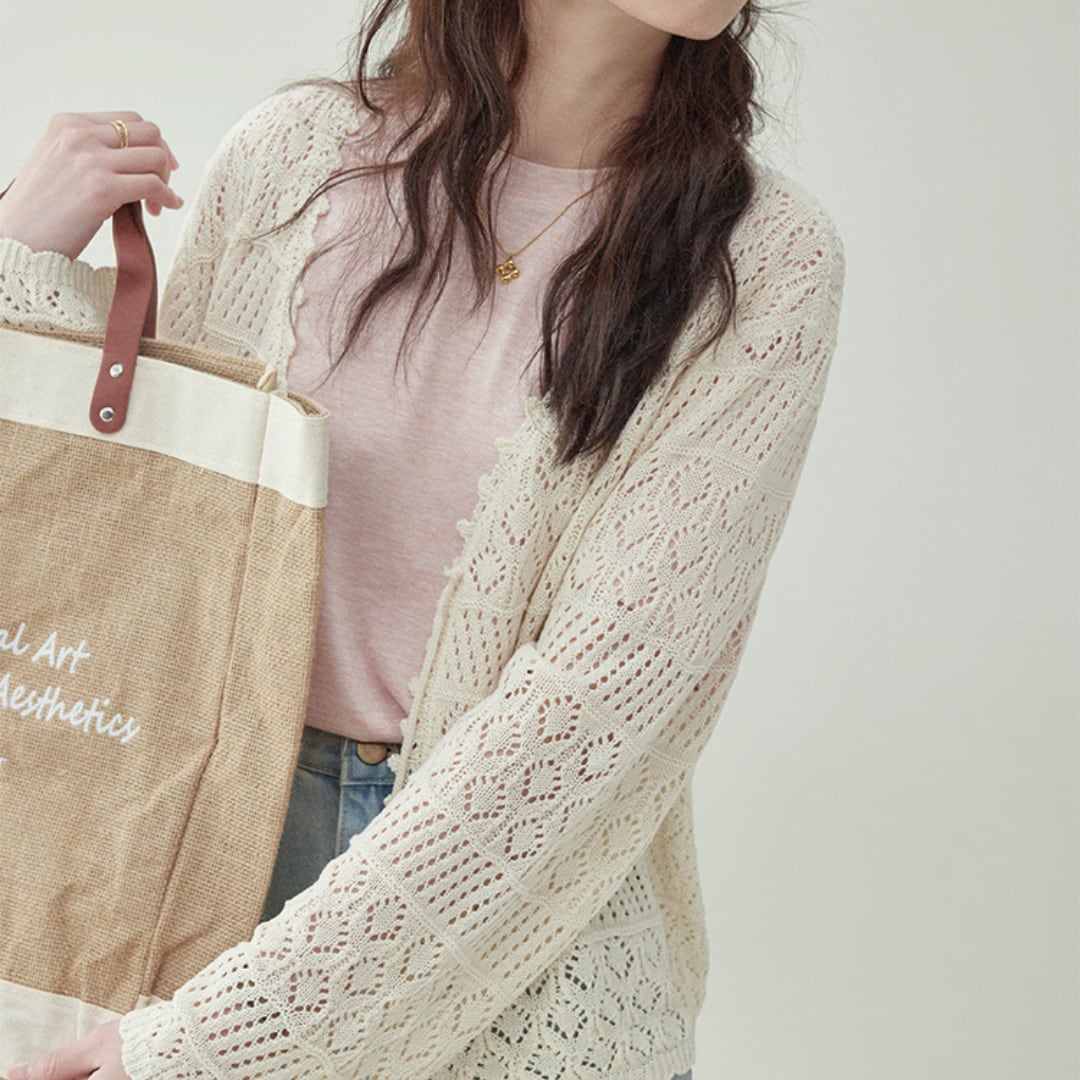 菱形の透かし模様が印象的な、やわらかな雰囲気を演出するレース編みカーディガン。