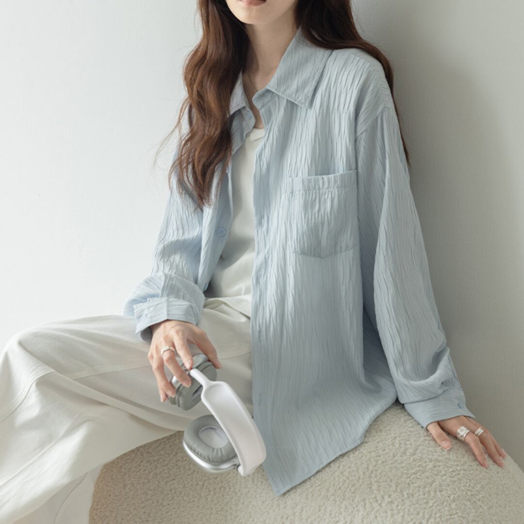 凹凸感のあるプリーツ風素材とゆったりとしたシルエットが印象的な長袖ブラウス。