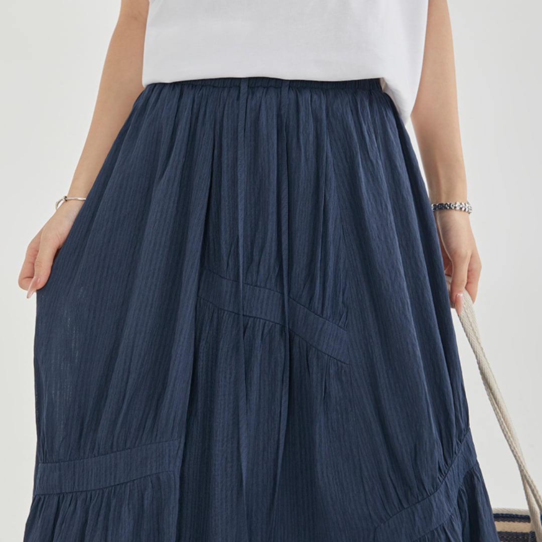 ランダムな切替デザインとシワ感素材が魅力の、軽やかで涼しげなロングスカート。