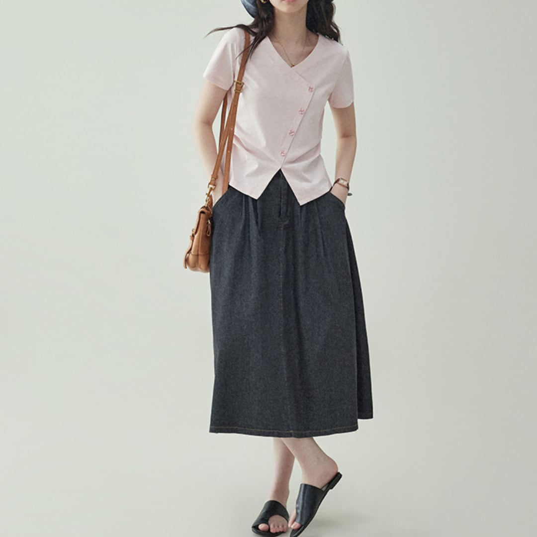 斜めに並んだボタンとすっきりしたVネックがフェミニンさを引き立てる、コンパクトなシルエットのトップス。 スカートにもパンツにも合わせやすく、夏のデイリースタイルに活躍する一着です。 【カラー】 ピンク、ブルー 【サイズ】 S 着丈:55cm 胸囲:86cm 肩幅:37cm 袖丈:16cm M 着丈:56cm 胸囲:90cm 肩幅:38cm 袖丈:17cm L 着丈:57cm 胸囲:94cm 肩幅:39cm 袖丈:18cm モデル身長168cm 着用サイズM 【素材】 綿65.3%、ポリエチレンテレフタレート(ポリエステル)34.7% ♦︎選べるお支払い方法 ・クレジットカード決済(VISA/Master/JCB/AMEX) ・キャリア決済(docomo/au/Softbank/Y!mobile) ・Amazon pay(ご利用不可の期間あり) ・Pay-easy ・後払い決済 ✴︎ Erz. ranking top 10 ✴︎ こちらから↓ https://www.erzofficial.com/categories/3617358 [ pickup item]イチオシアイテム↓ https://www.erzofficial.com/categories/3558579 Erz.がご提案する大人のレトロカジュアルって? https://www.erzofficial.com/blog/2021/09/06/123341 【お届けについて】 こちらの商品は海外店舗より直接発送となる為、 ご入金から最短10日〜4週間前後で発送致します。 ◼️注意事項 ・タイミングによっては 商品在庫切れにより 注文キャンセルとさせていただく恐れもございますので、予めご了承くださいませ。 ・こちらは輸入品となります。日本製とは検品基準が異なる為、 ・新品未使用品でもごくわずかな汚れや ほつれがある場合もございます。 ・明らかな不良があった場合お手数ですが、お早めにご連絡をお願い致します。 ご確認後、ご返金、返品対応させていただきますのでご安心ください。 ・仕入れ工場を変えることがあるため、記載サイズと若干異なる場合がございます。 ・商品の色味は、お手持ちのスマートフォンの画面によって実物と若干異なる場合がございます。 ・イメージ違いやサイズ交換等、不良品以外の返品は対応出来かねます。 ・ご注文後のキャンセルは、ご遠慮いただいております。 ———————————— ご購入前にこちらをお読みください。 https://alroom.thebase.in/about 商品番号 SH