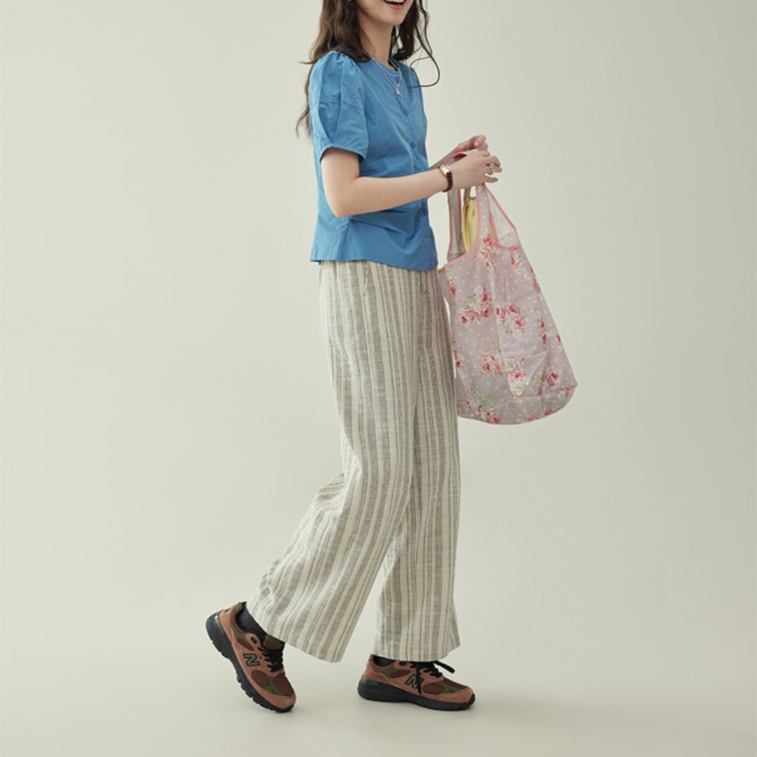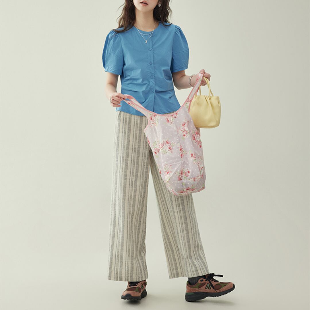 程よいボリュームのパフスリーブとフロントのギャザーが女性らしい印象を引き立てるブラウス。