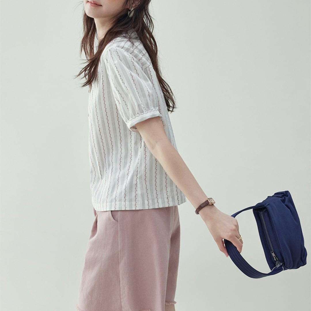 くるみボタンとやわらかなパフスリーブがフェミニンな雰囲気を演出する、爽やかなストライプ柄シャツ。
