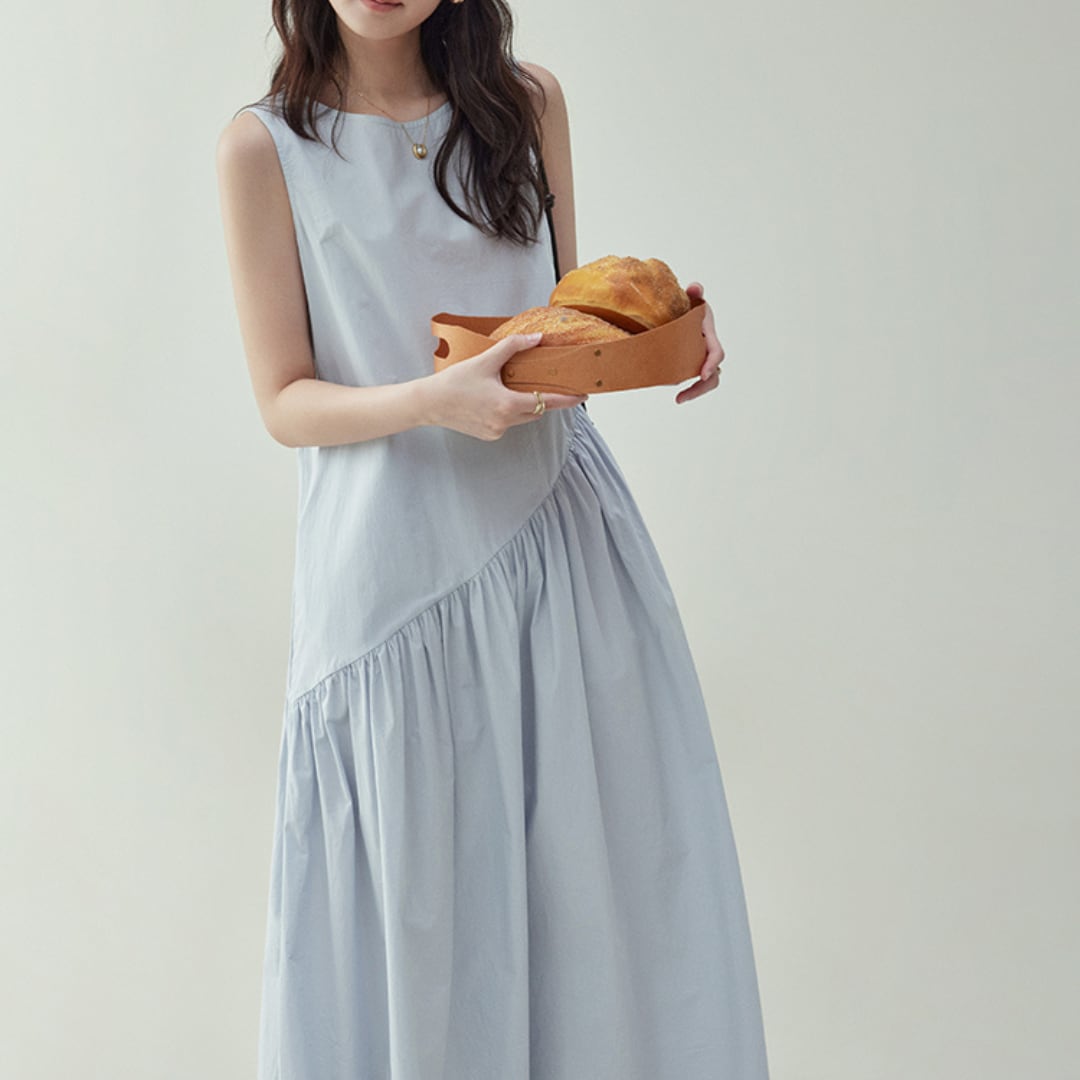 斜めに施されたギャザー切替が動きを生む、上品で軽やかなノースリーブワンピース。