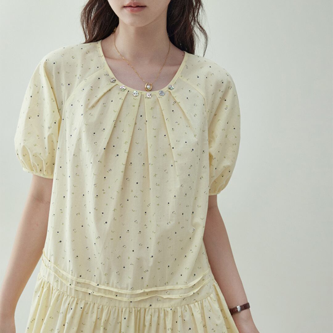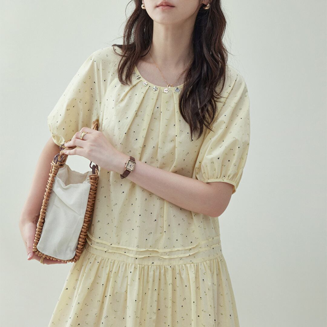 ふんわりとしたパフスリーブと胸元のギャザーが女性らしいシルエットを演出する、小花柄のワンピース。
