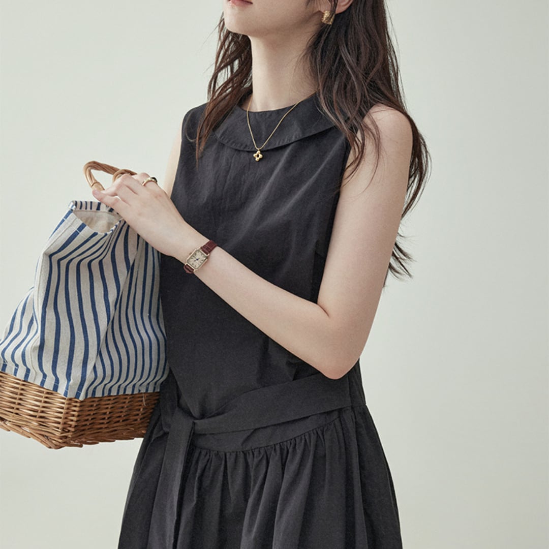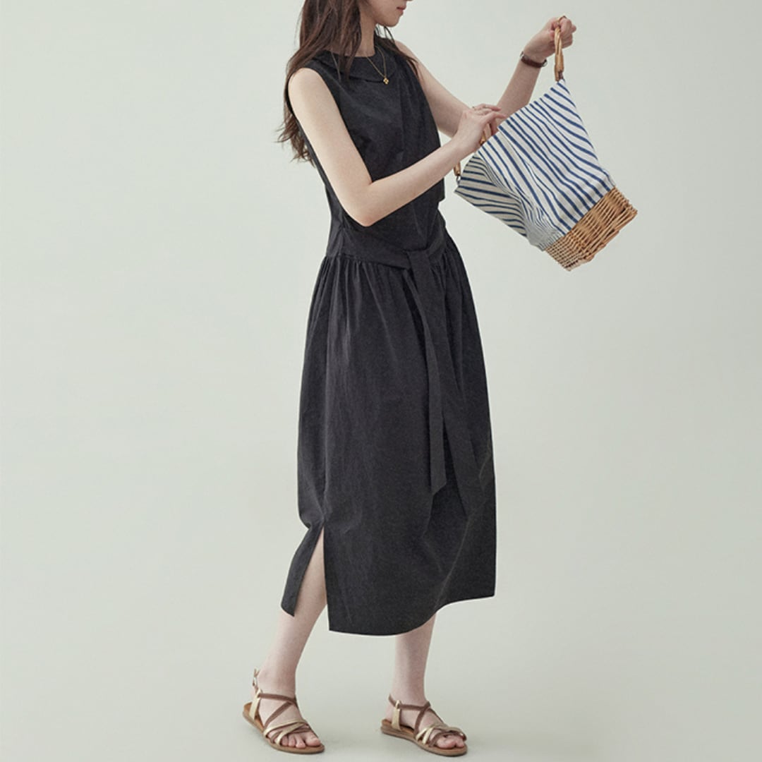 すっきりとしたノースリーブデザインに、ウエストリボンでシルエット調整ができる上品なロングワンピース。