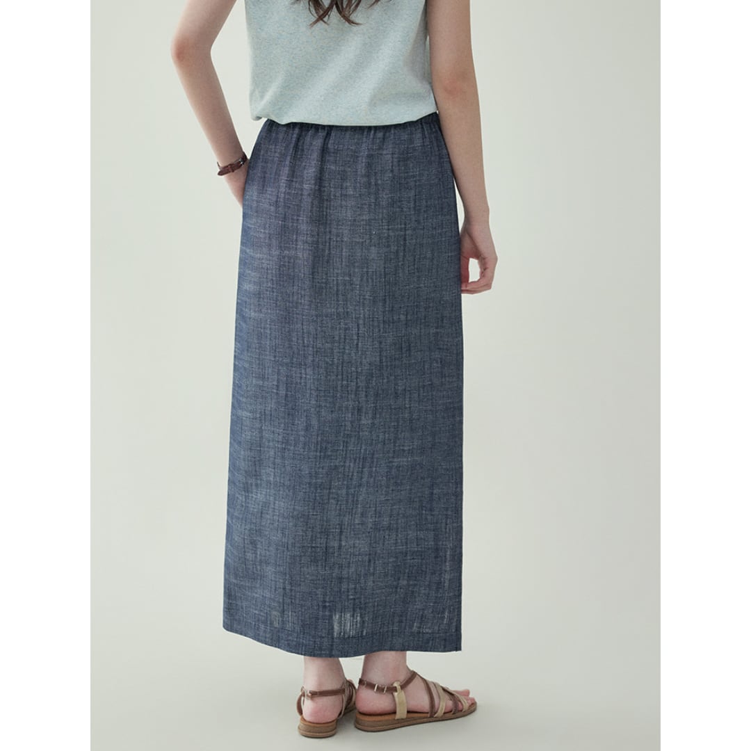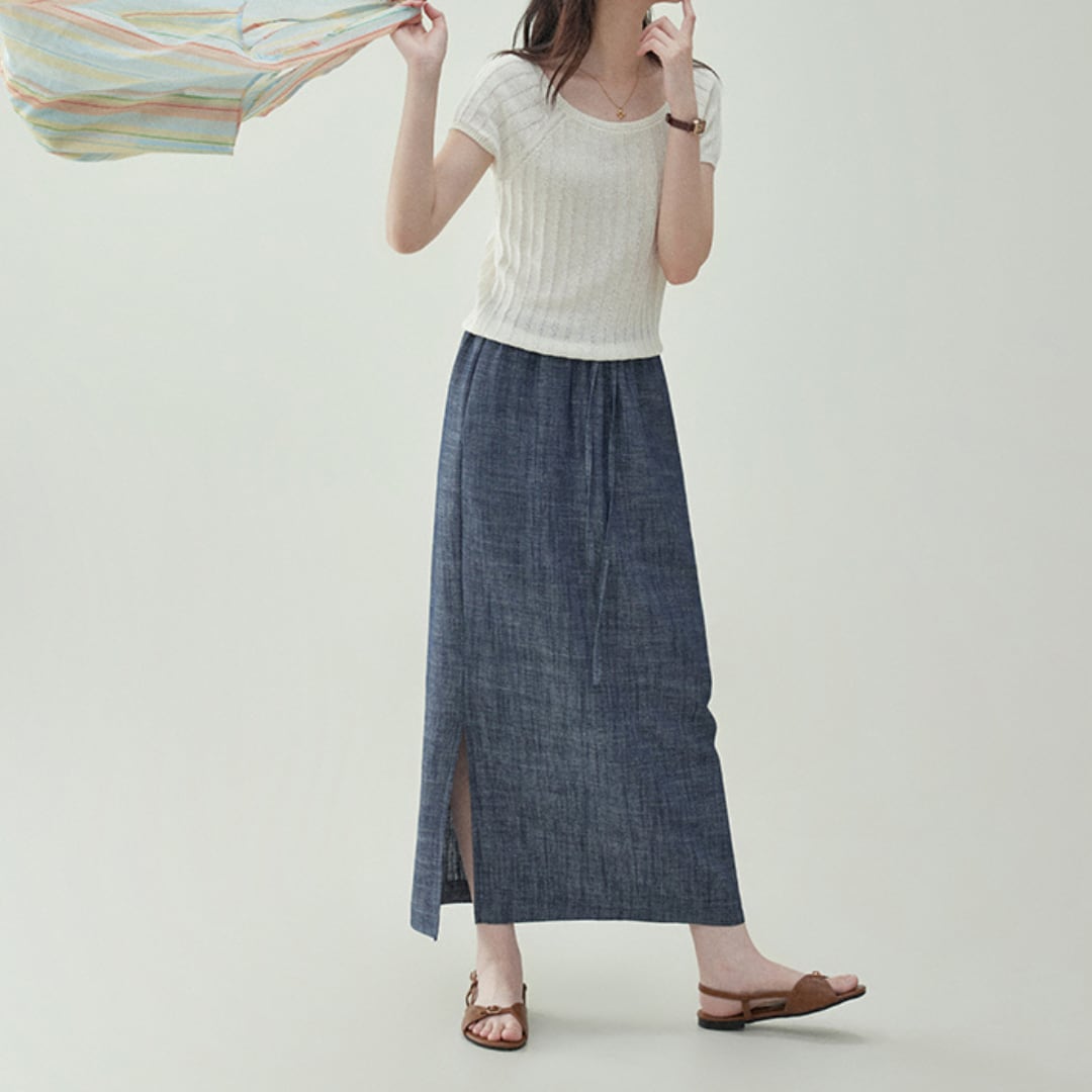 ナチュラルな風合いの素材感に、ウエストのドローストリングがポイントのミディ丈スカート。