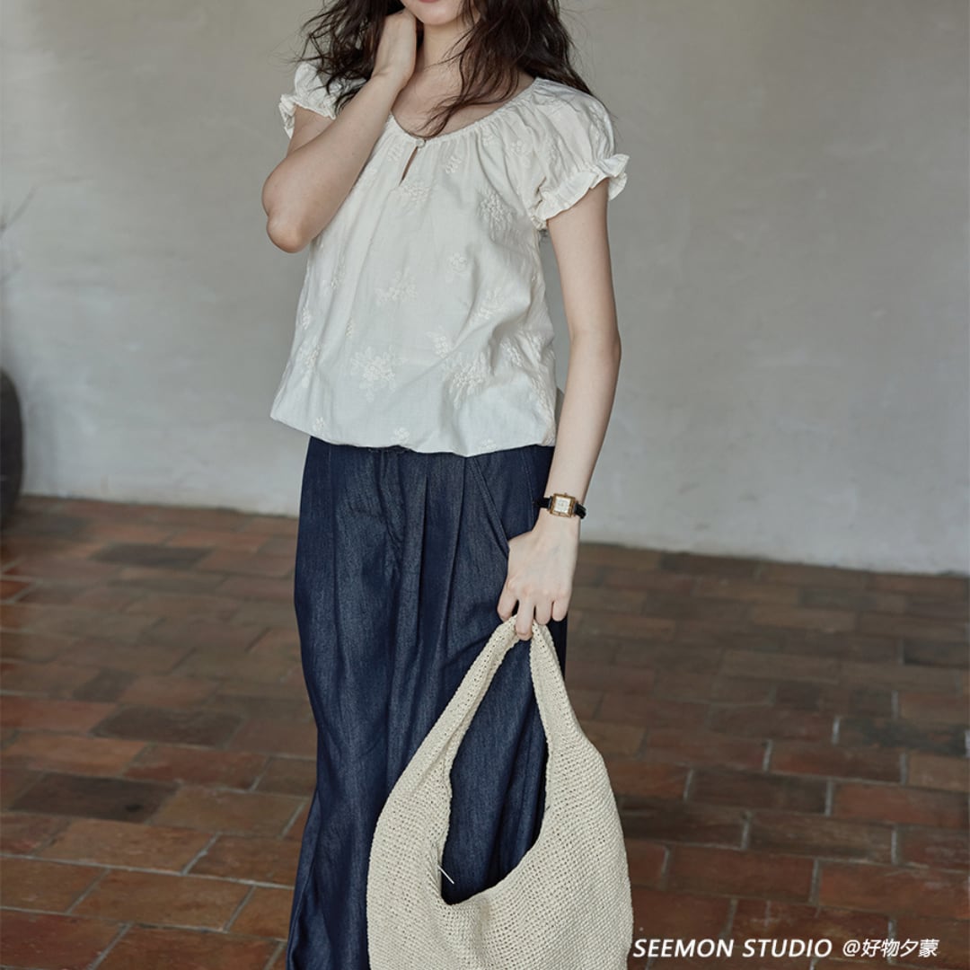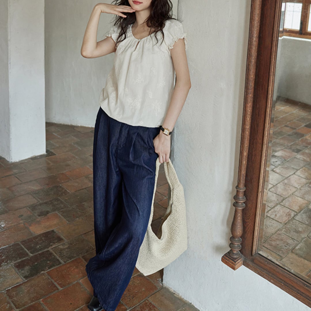繊細な刺繍とふんわりとしたフレンチスリーブがやさしい雰囲気を醸し出すブラウス。