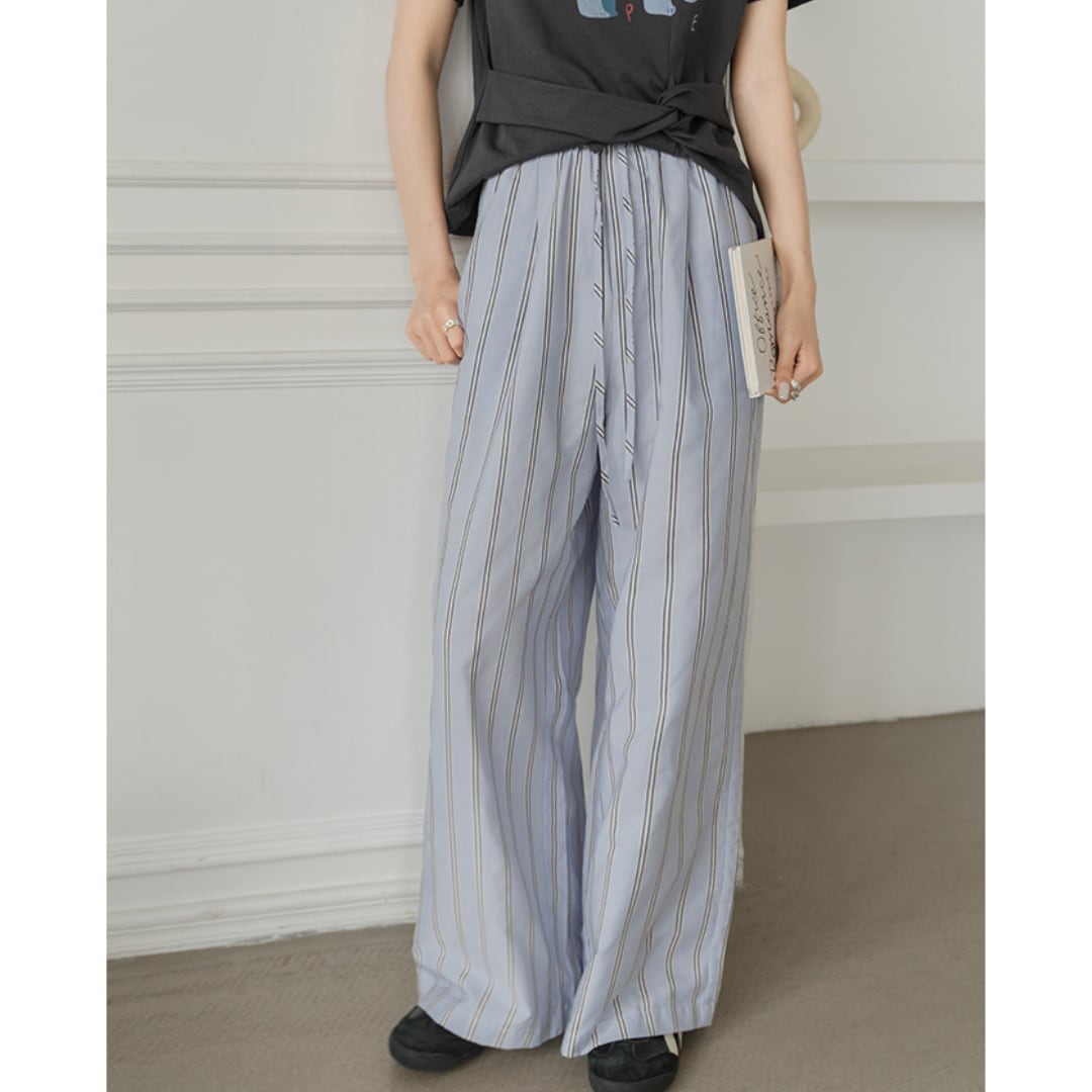 ナチュラルな落ち感とストライプ柄が魅力の、ウエストゴム仕様のリラックスパンツ。