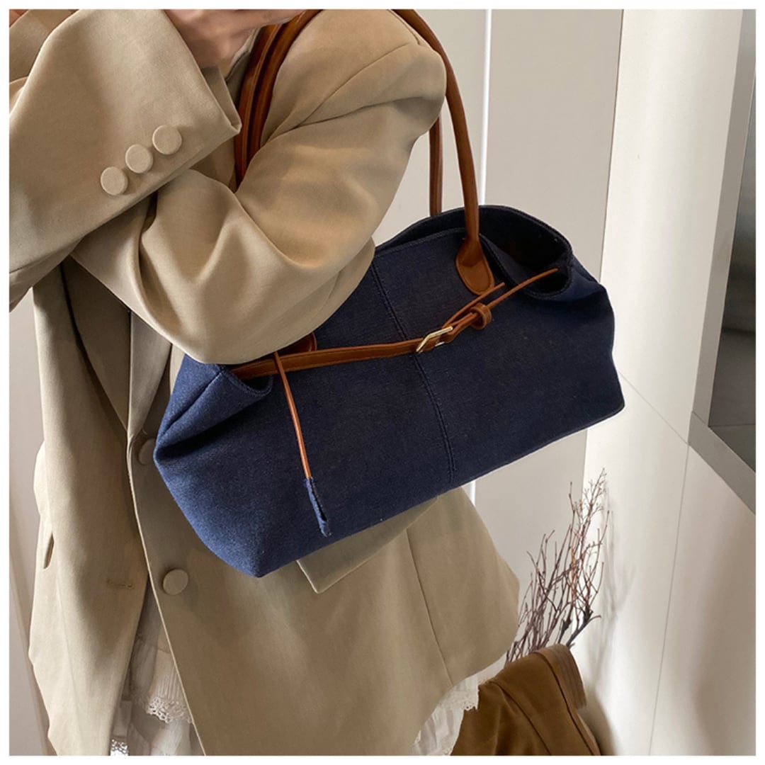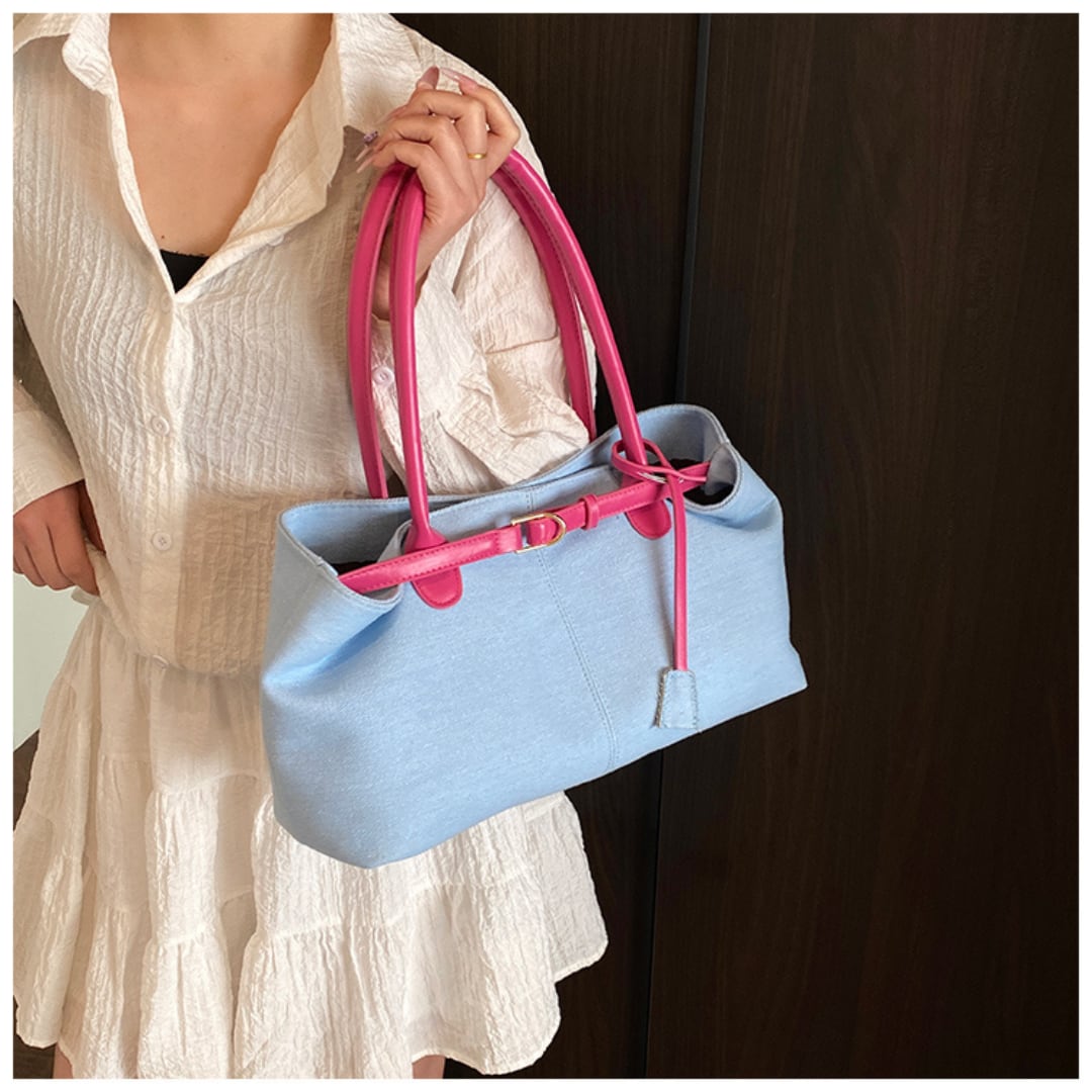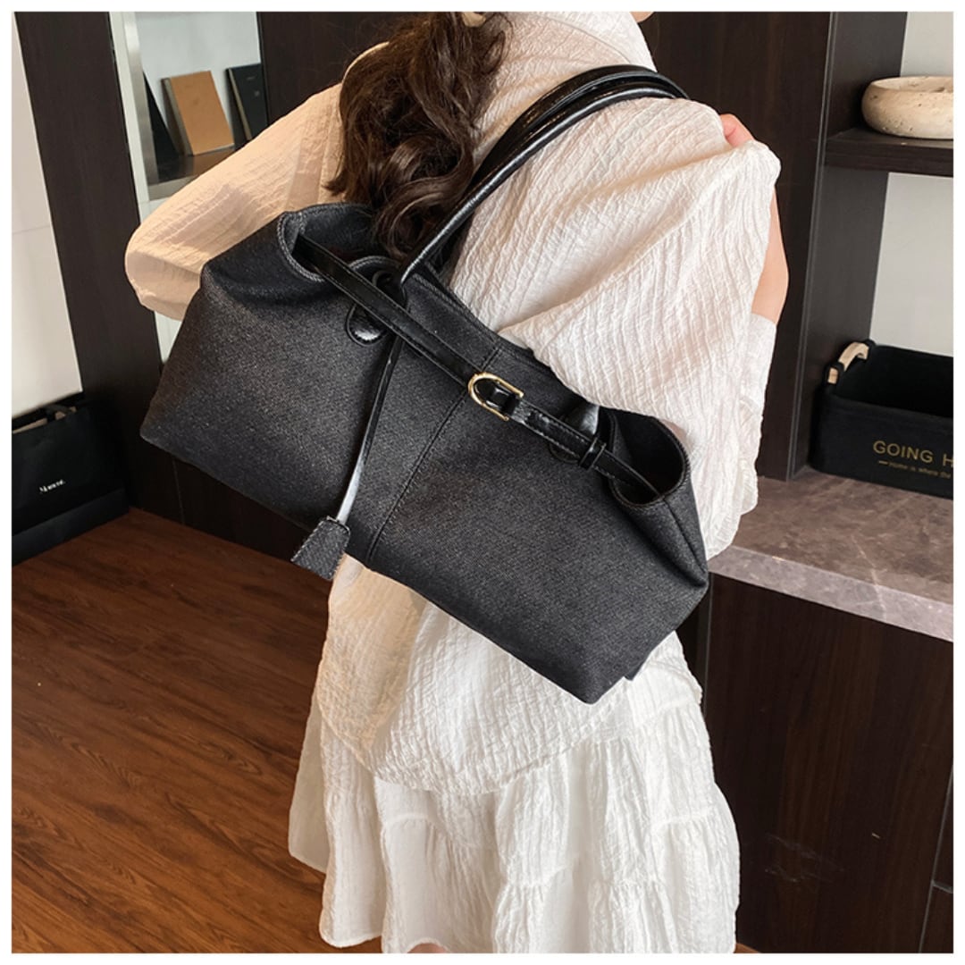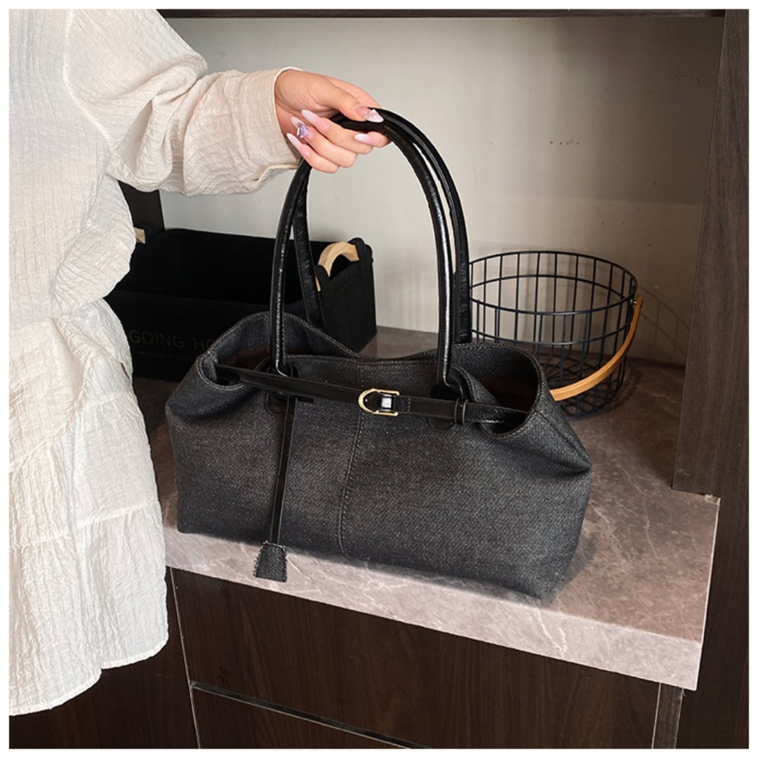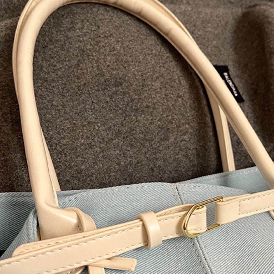 コントラストの効いたハンドルとベルトが印象的なトートバッグは、上品さとカジュアル感を兼ね備えた万能デザイン。