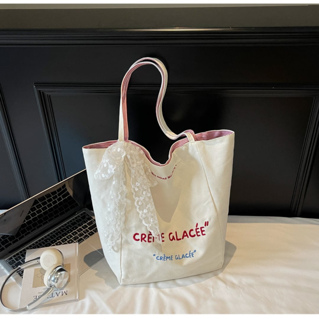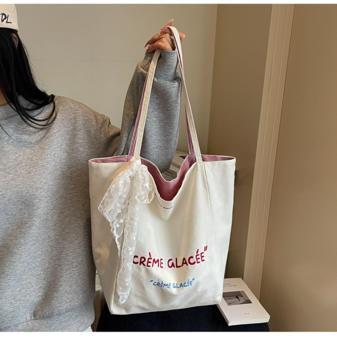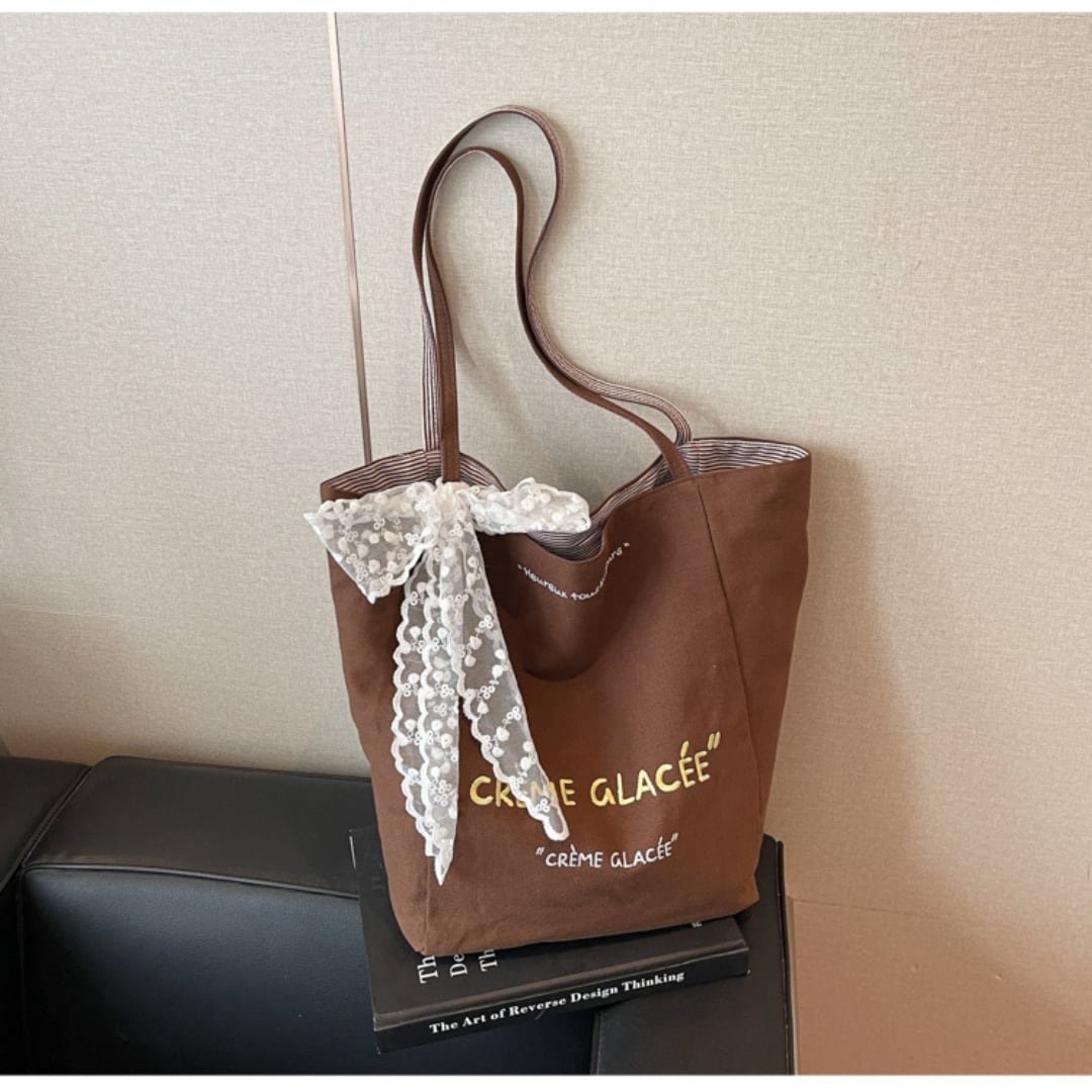 ロゴプリントとレースリボンが目を引くキャンバストートバッグは、ナチュラルな風合いでスタイルにやさしく馴染むデザイン。