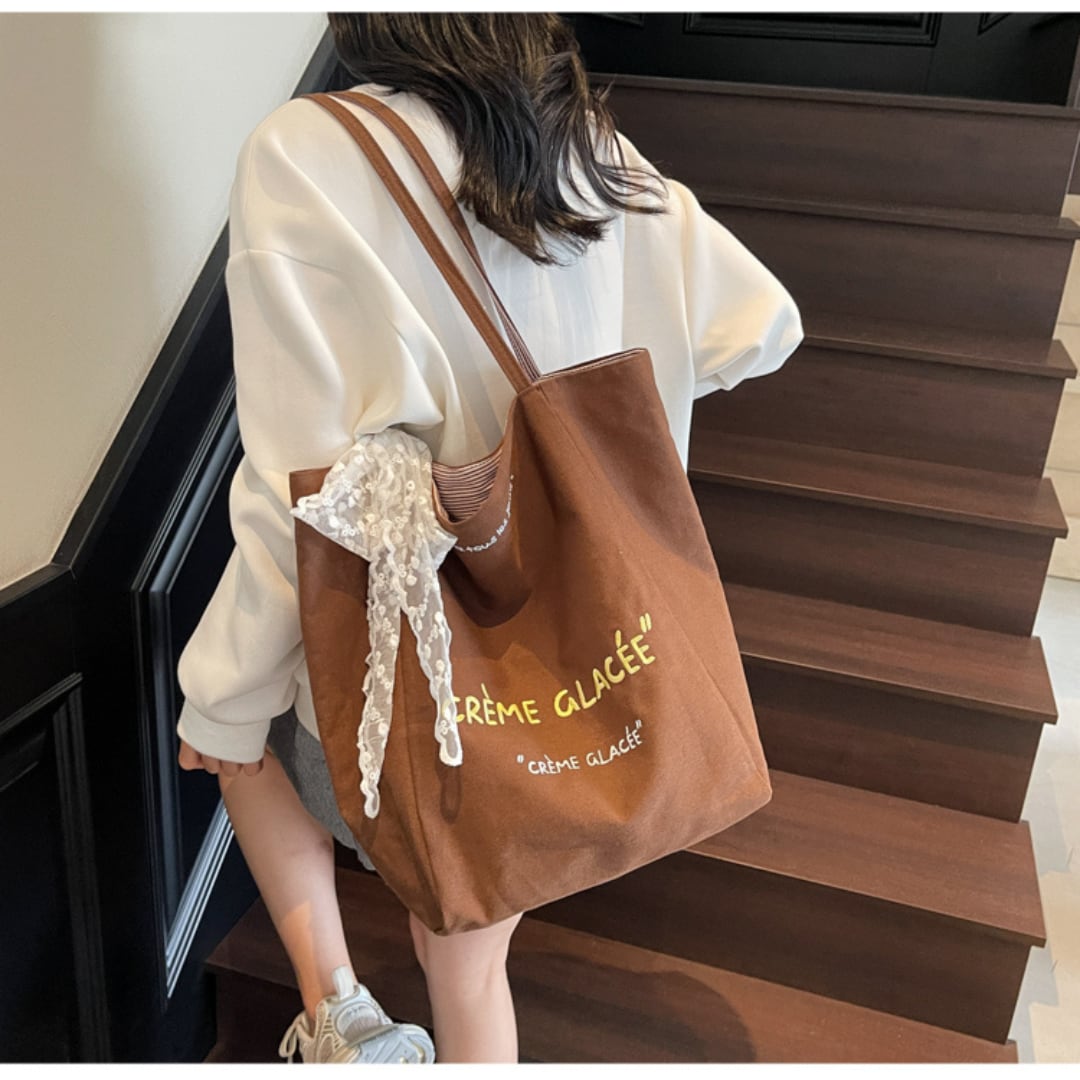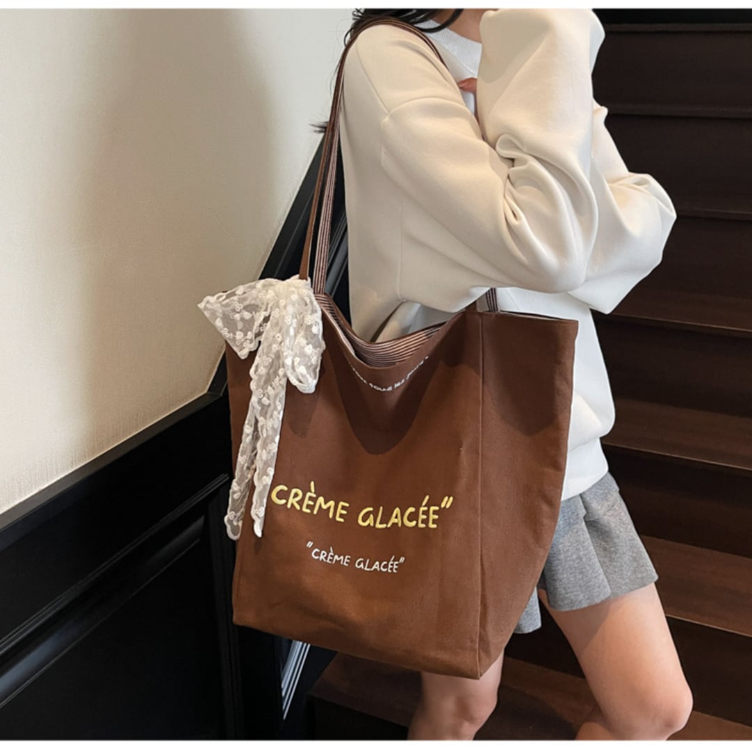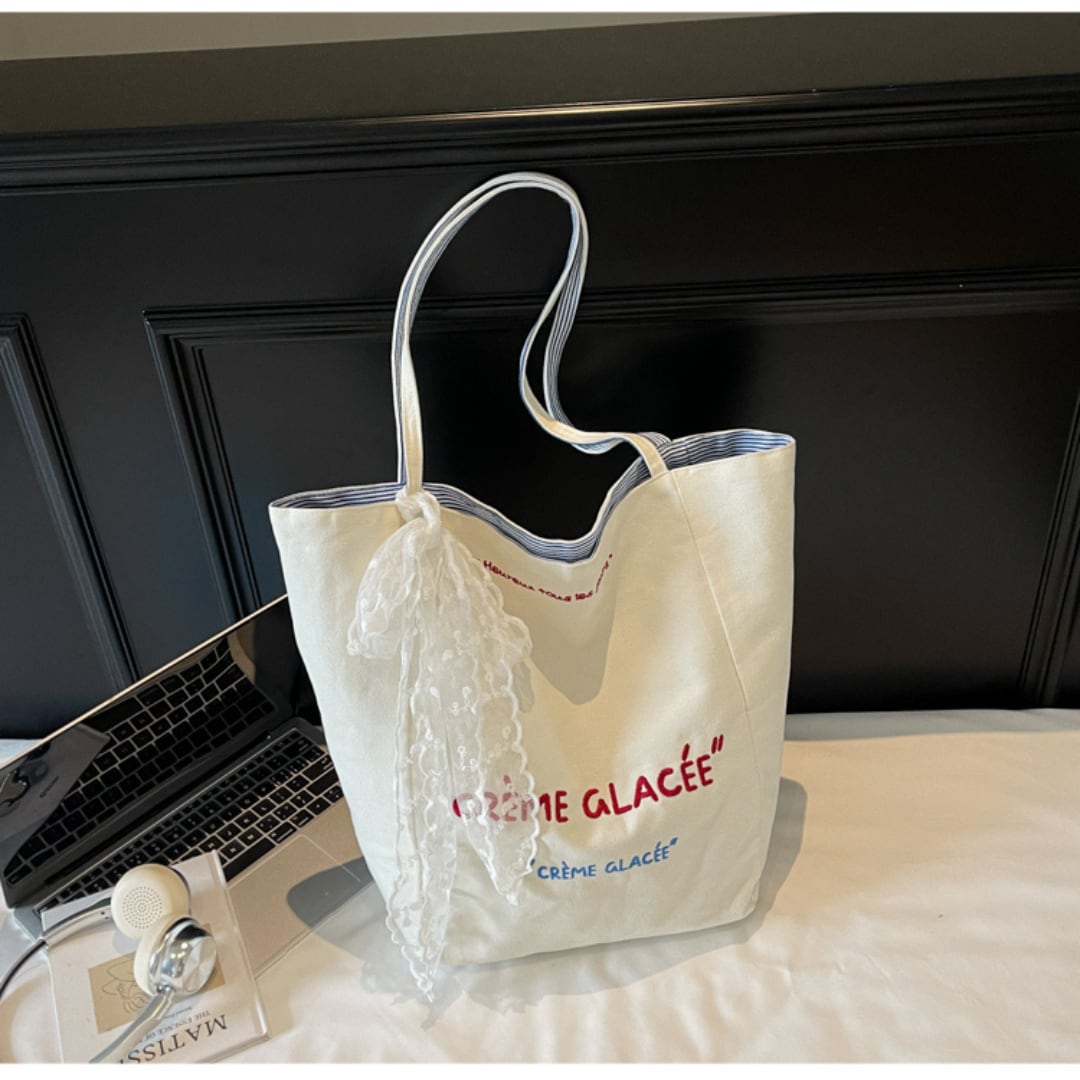 ロゴプリントとレースリボンが目を引くキャンバストートバッグは、ナチュラルな風合いでスタイルにやさしく馴染むデザイン。