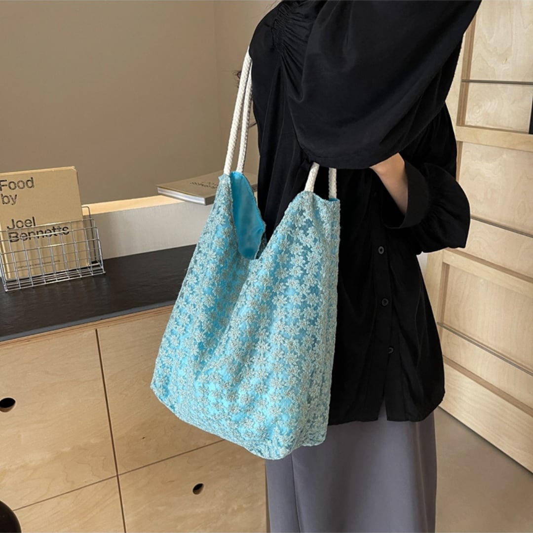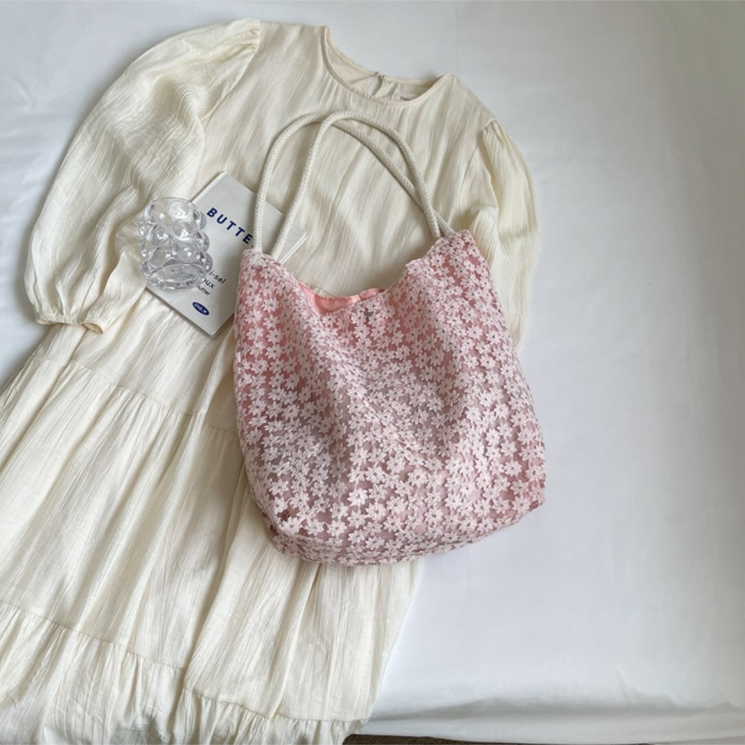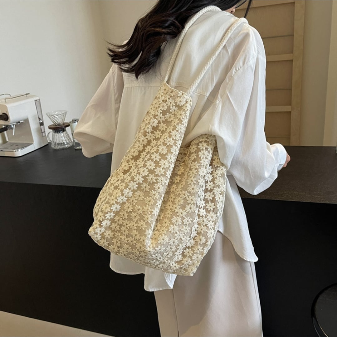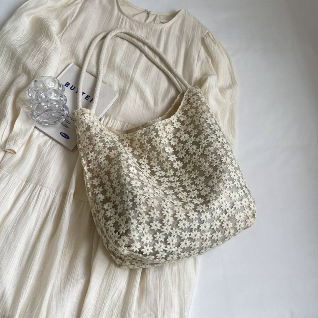立体的な花柄刺繍が華やかさを添えるトートバッグは、軽やかな布素材でフェミニンな印象を演出。
