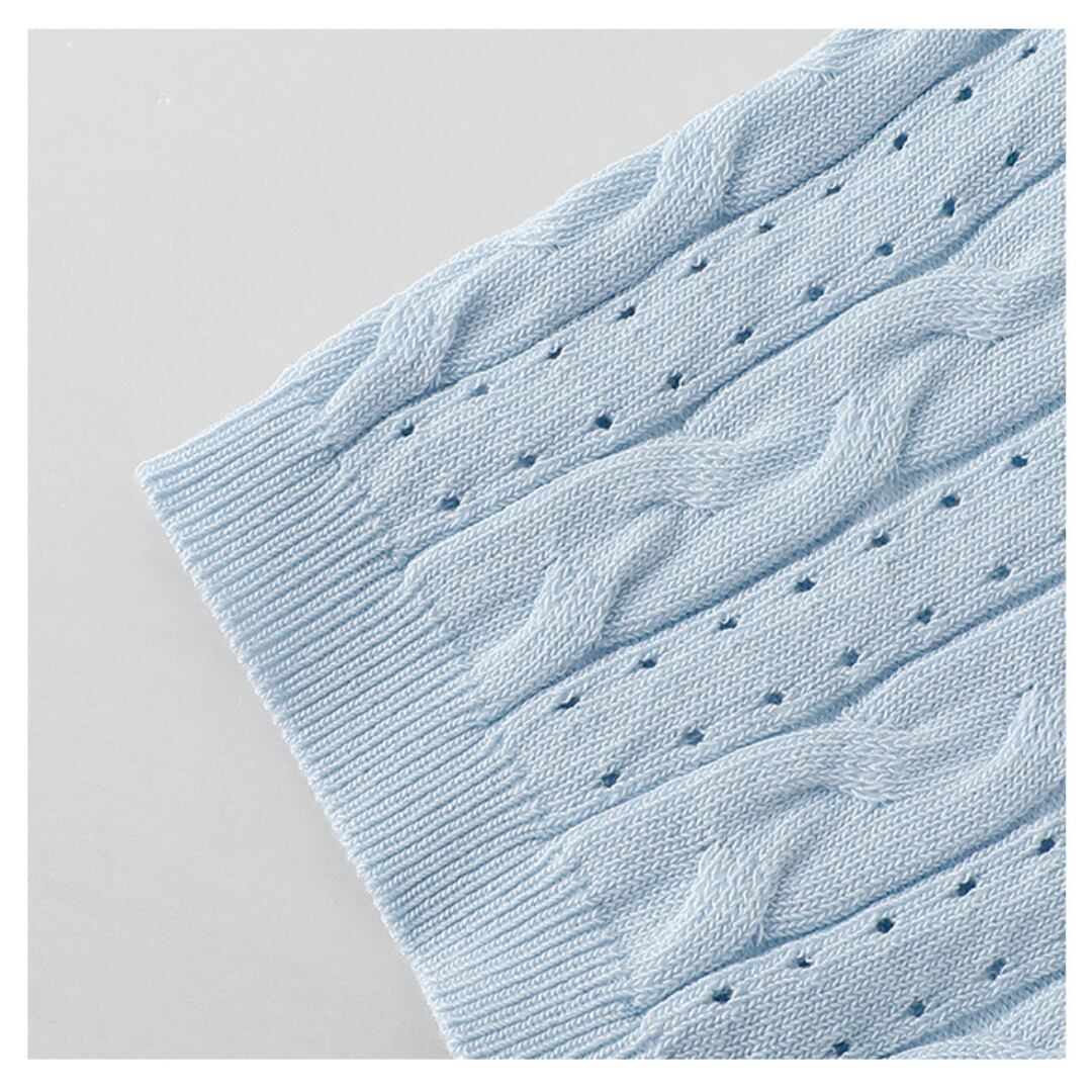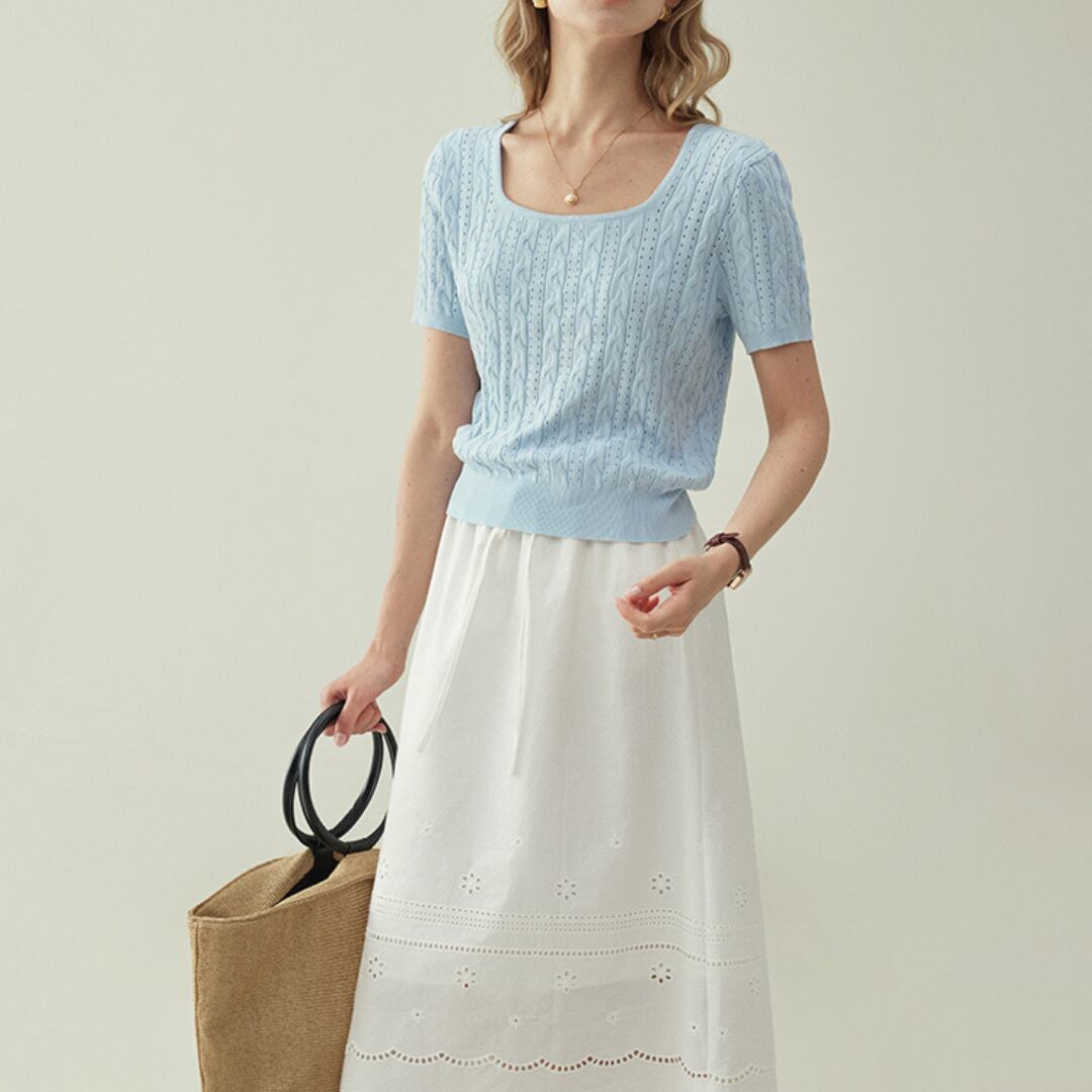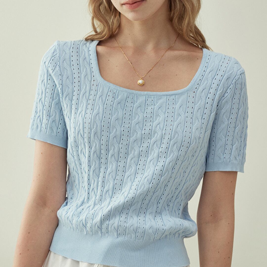 ケーブル風の透かし編みとスクエアネックが上品で涼しげな印象を与えるニットトップス。