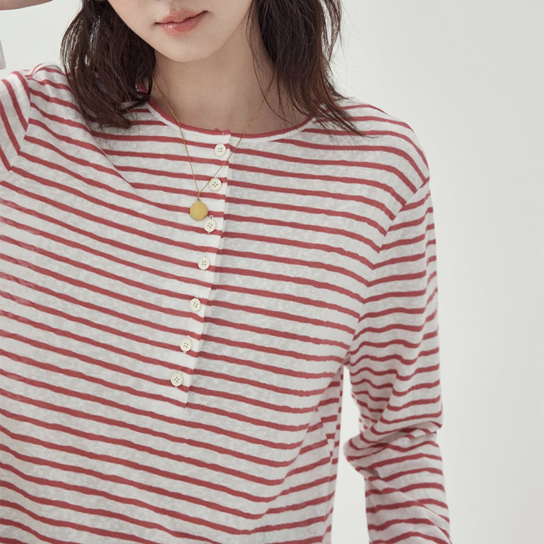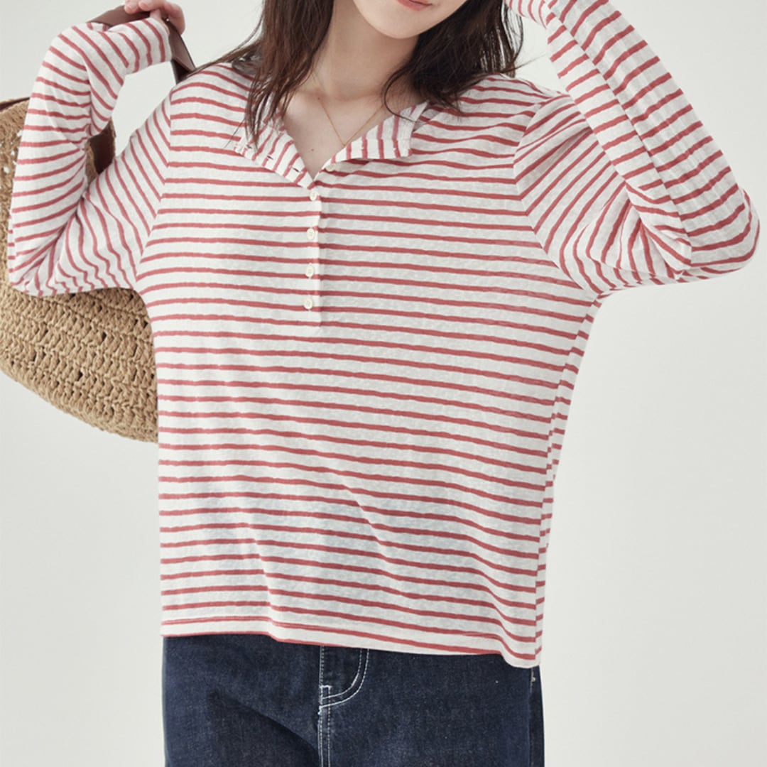 前開きのボタンデザインがアクセントになった、ゆったりとしたシルエットのボーダープルオーバー。