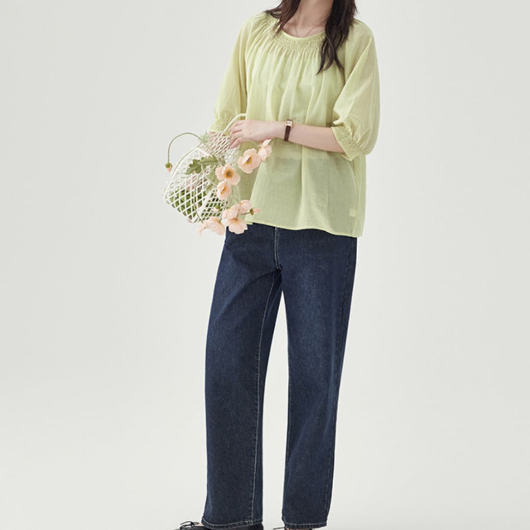 ネックと袖口にシャーリングを施した、ふんわりとしたシルエットが魅力のプルオーバーブラウス。