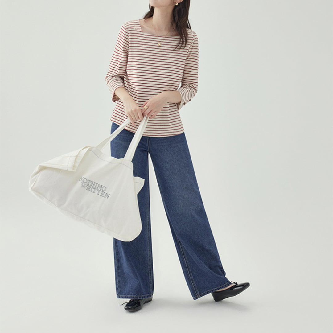 スクエアネックと袖口の小さなボタンがアクセントになった七分袖のボーダートップス。