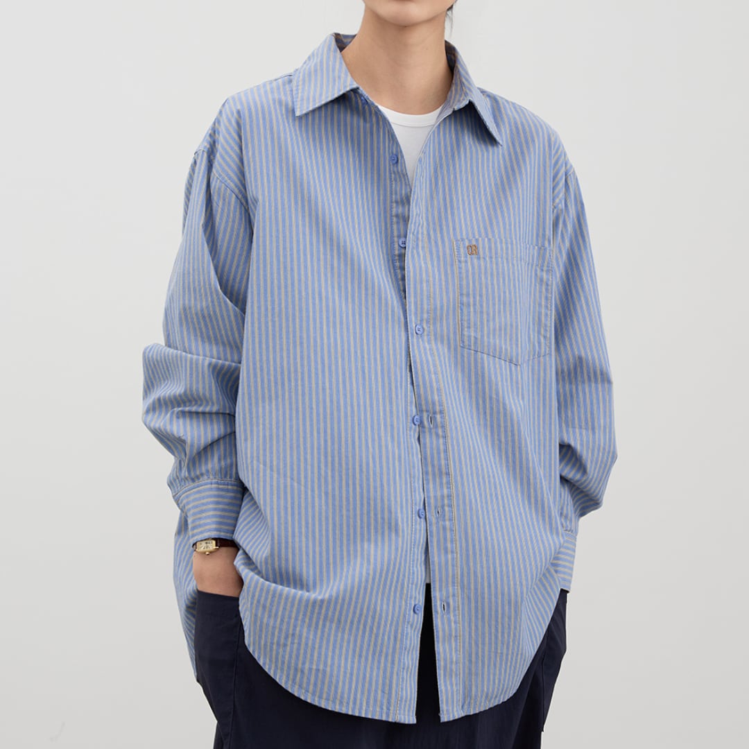 顔まわりをすっきり見せるレギュラーカラーと、抜け感のあるワイドシルエットが魅力のストライプシャツ。