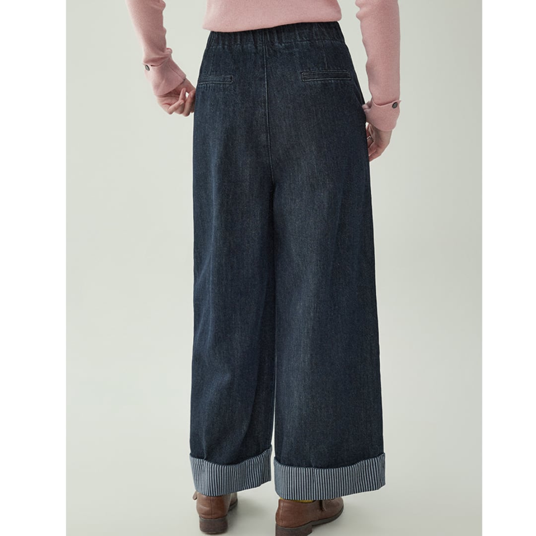 ワイドなシルエットと折り返しデザインが印象的な、トレンド感のあるハイウエストデニムパンツ。