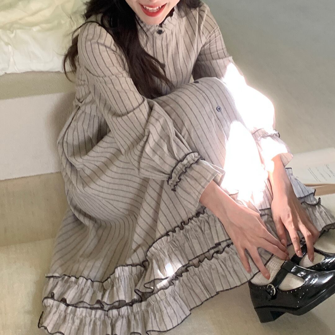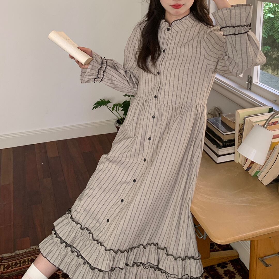 フリル襟と細かなピンタックがクラシカルな印象を与える、Aラインシルエットのワンピース。