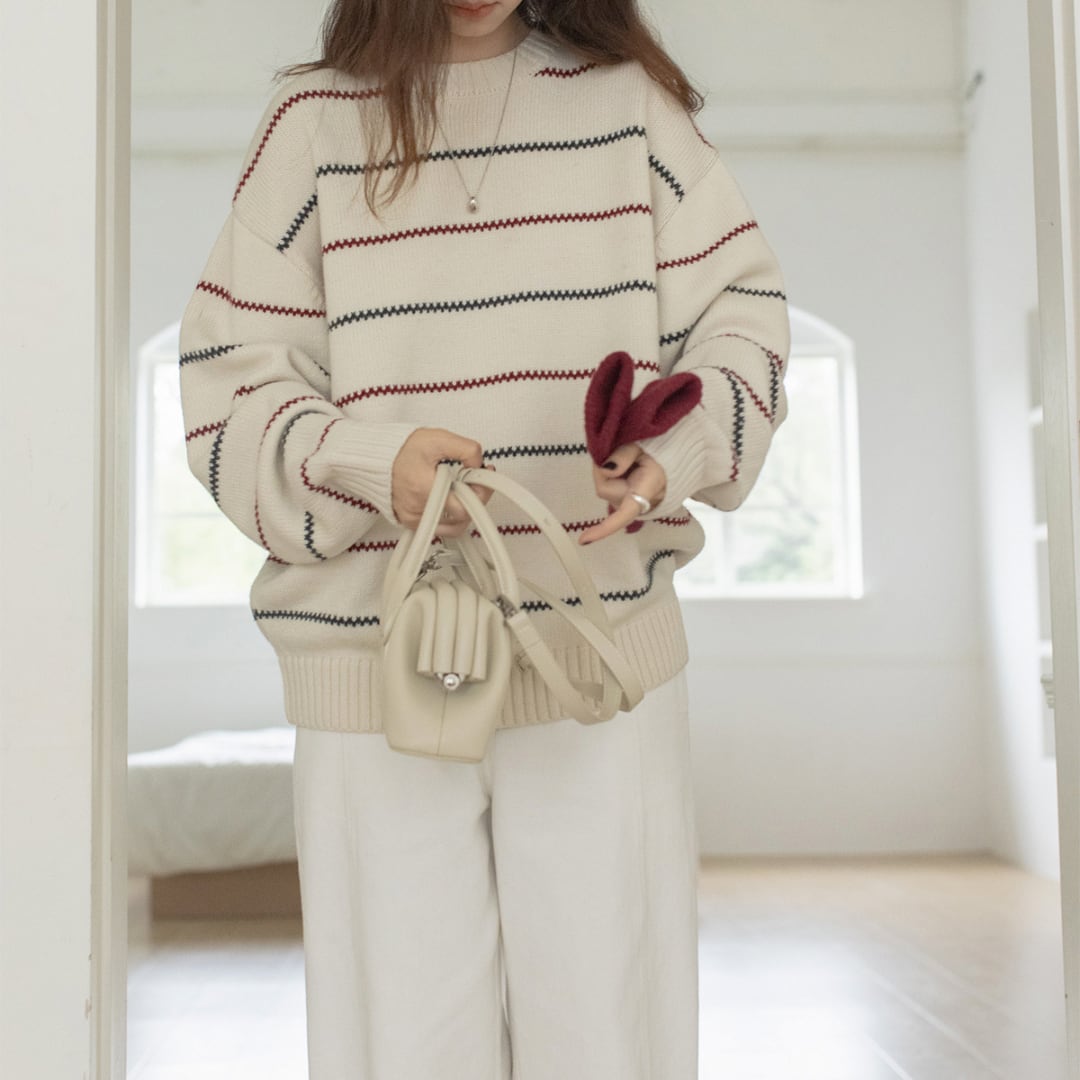 淡い配色のボーダーが柔らかな印象を与える、ウール混のクルーネックニット。