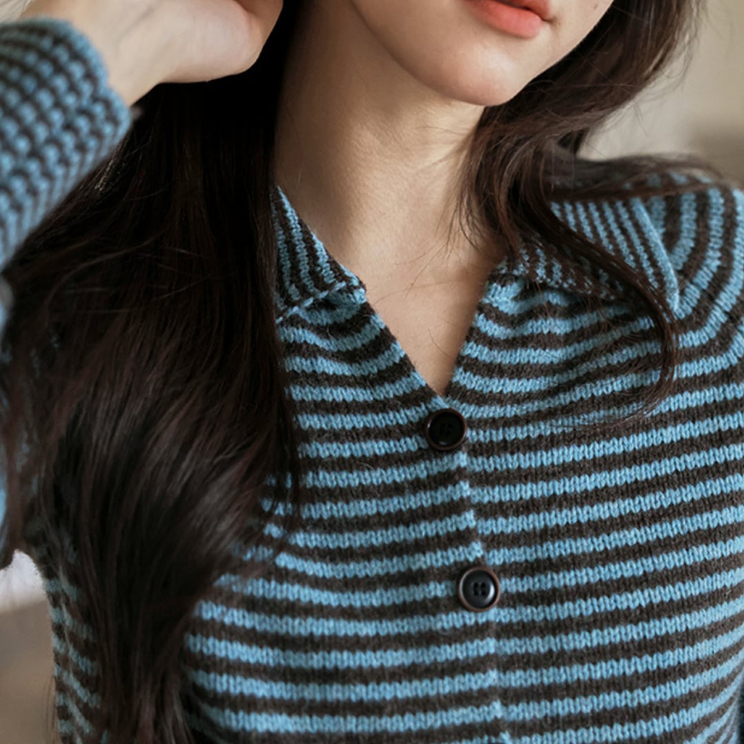 立体感のある編地と細かなストライプ柄が印象的な、長袖ニットカーディガン。