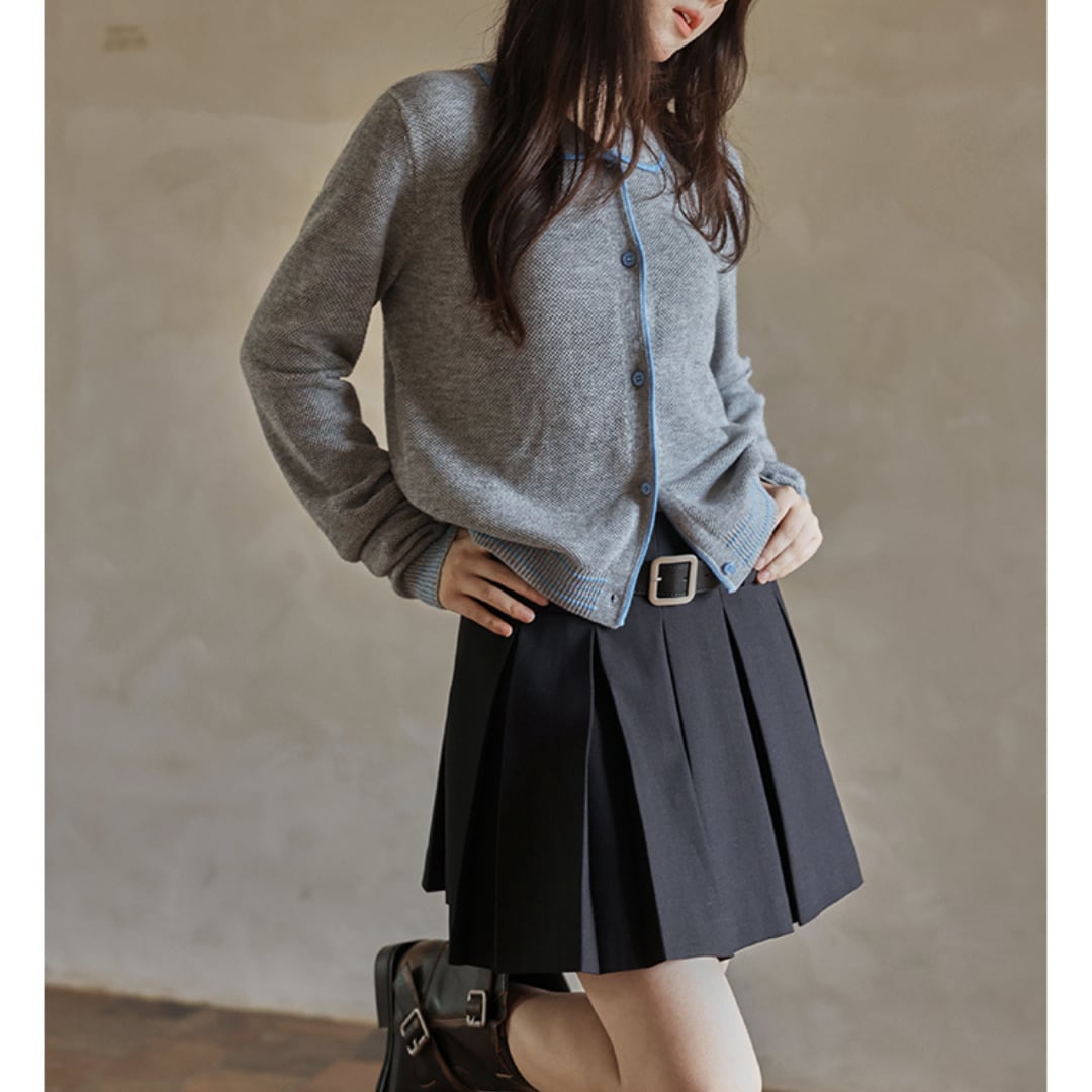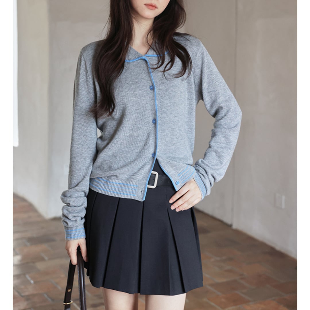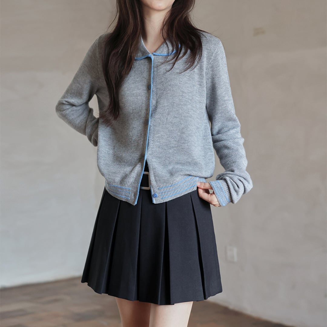 襟元と縁取りの配色がポイントになった、上品な印象のポロカラーニットカーディガン。