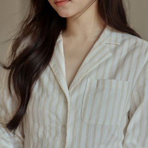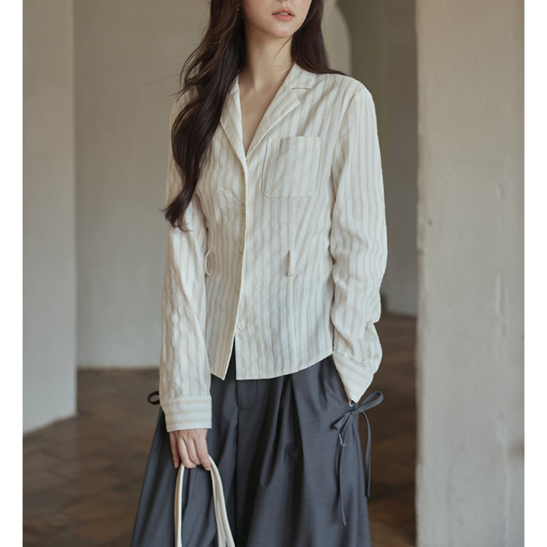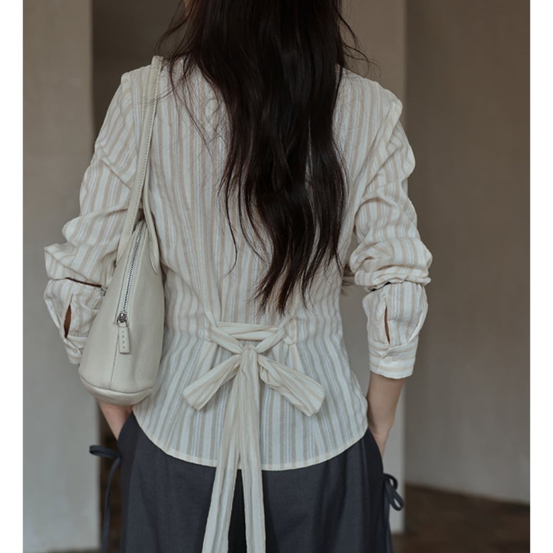 細かなストライプ柄にウエストベルトをプラスした、上品で女性らしい印象のシャツ。