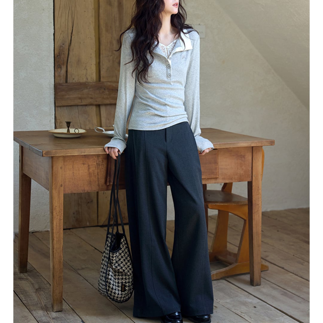 襟元の切り替えデザインと胸元の刺繍が、シンプルながらも洗練された雰囲気を演出するトップス。