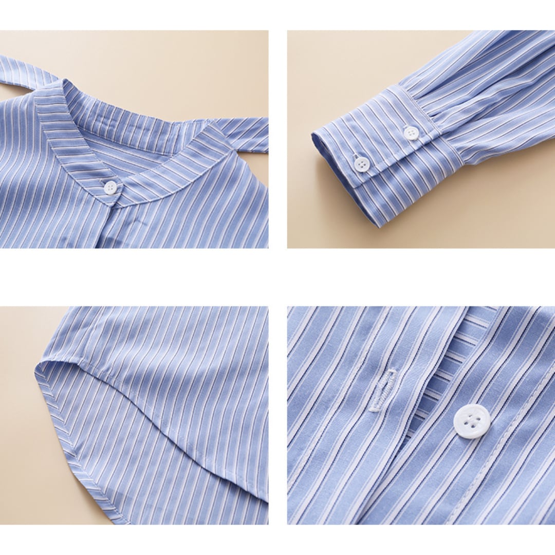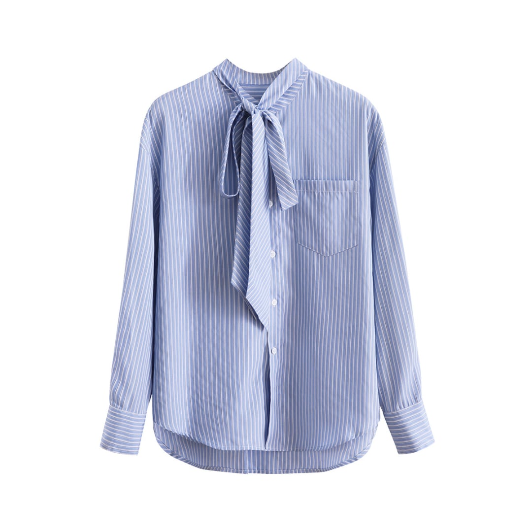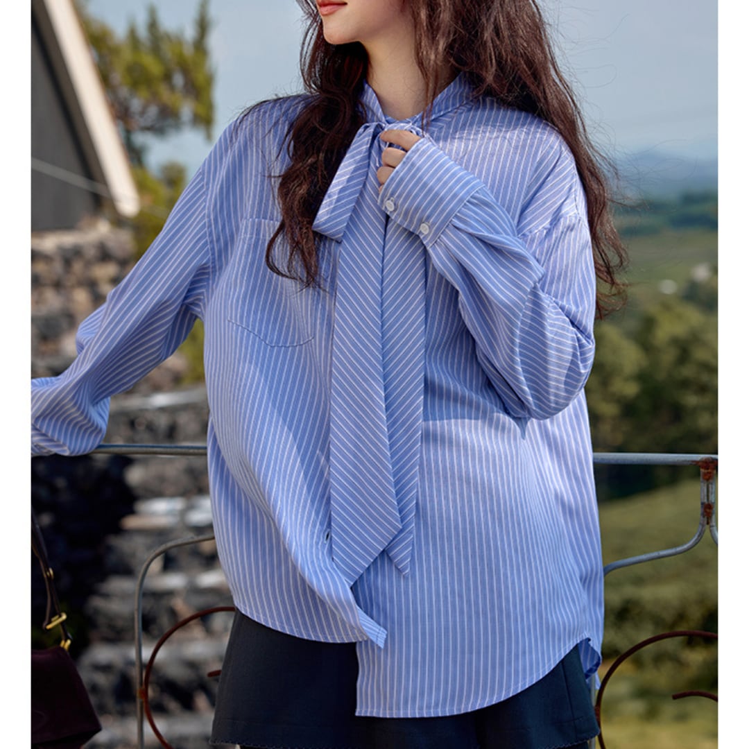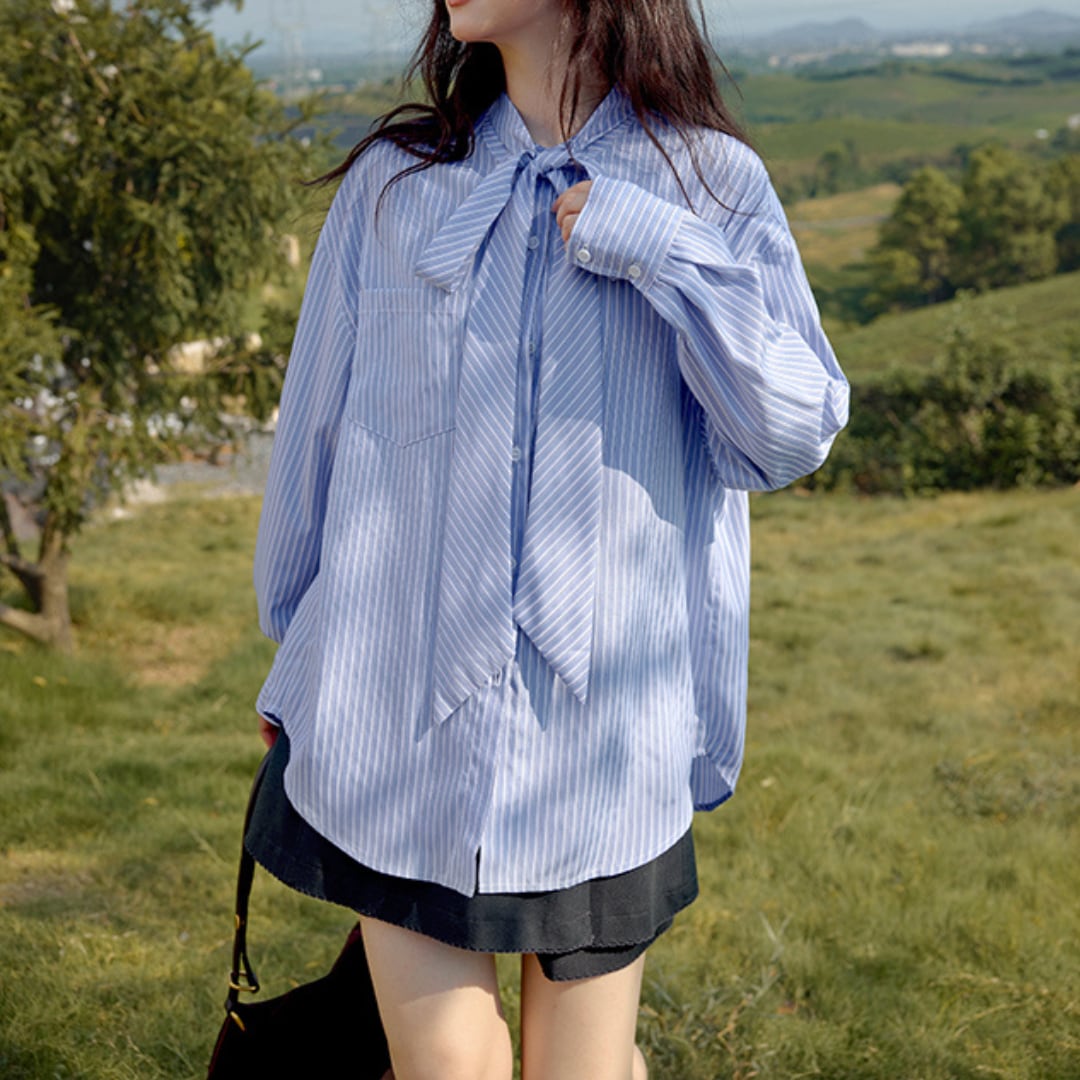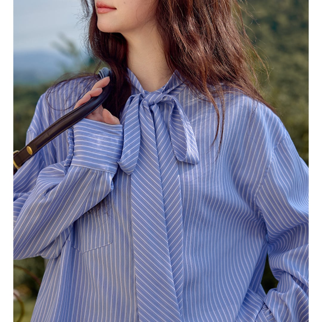さらりとした風合いとストライプ柄が清涼感を演出するリボンタイ付きブラウス。