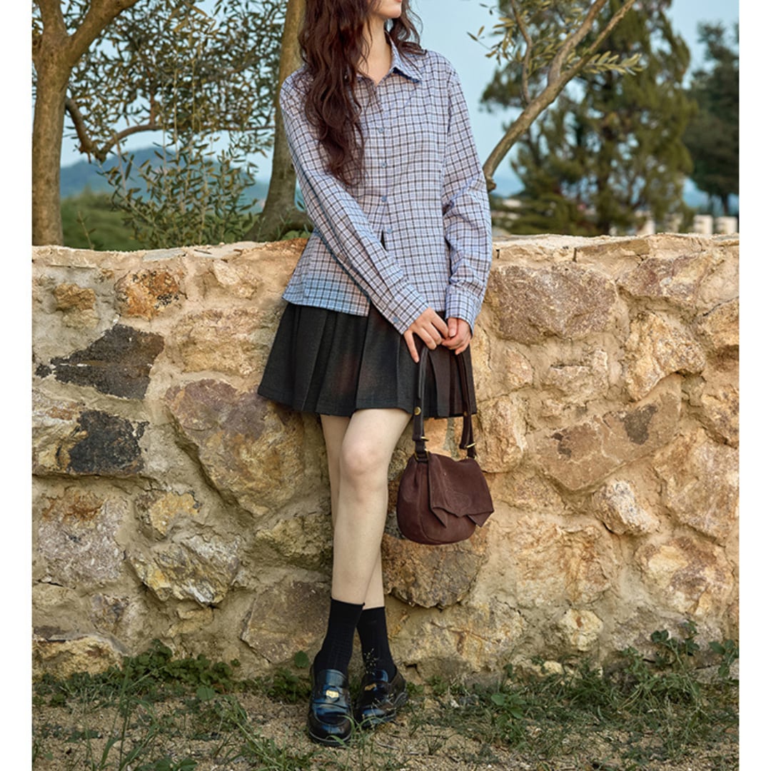 ウエストにタックを入れたシルエットが美しい、クラシカルな印象のチェック柄シャツ。