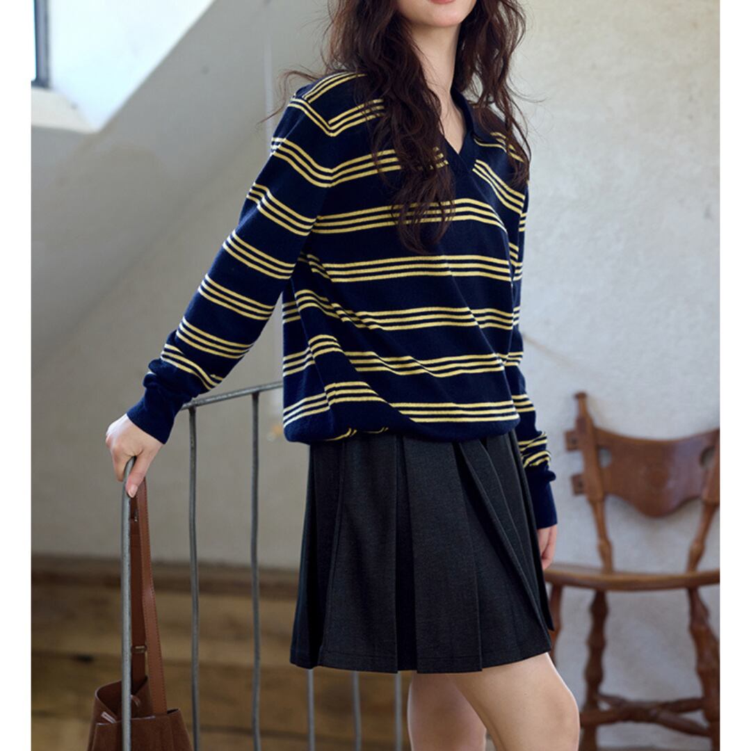 クラシカルな配色のボーダーとVネックデザインが特徴のニットトップス。