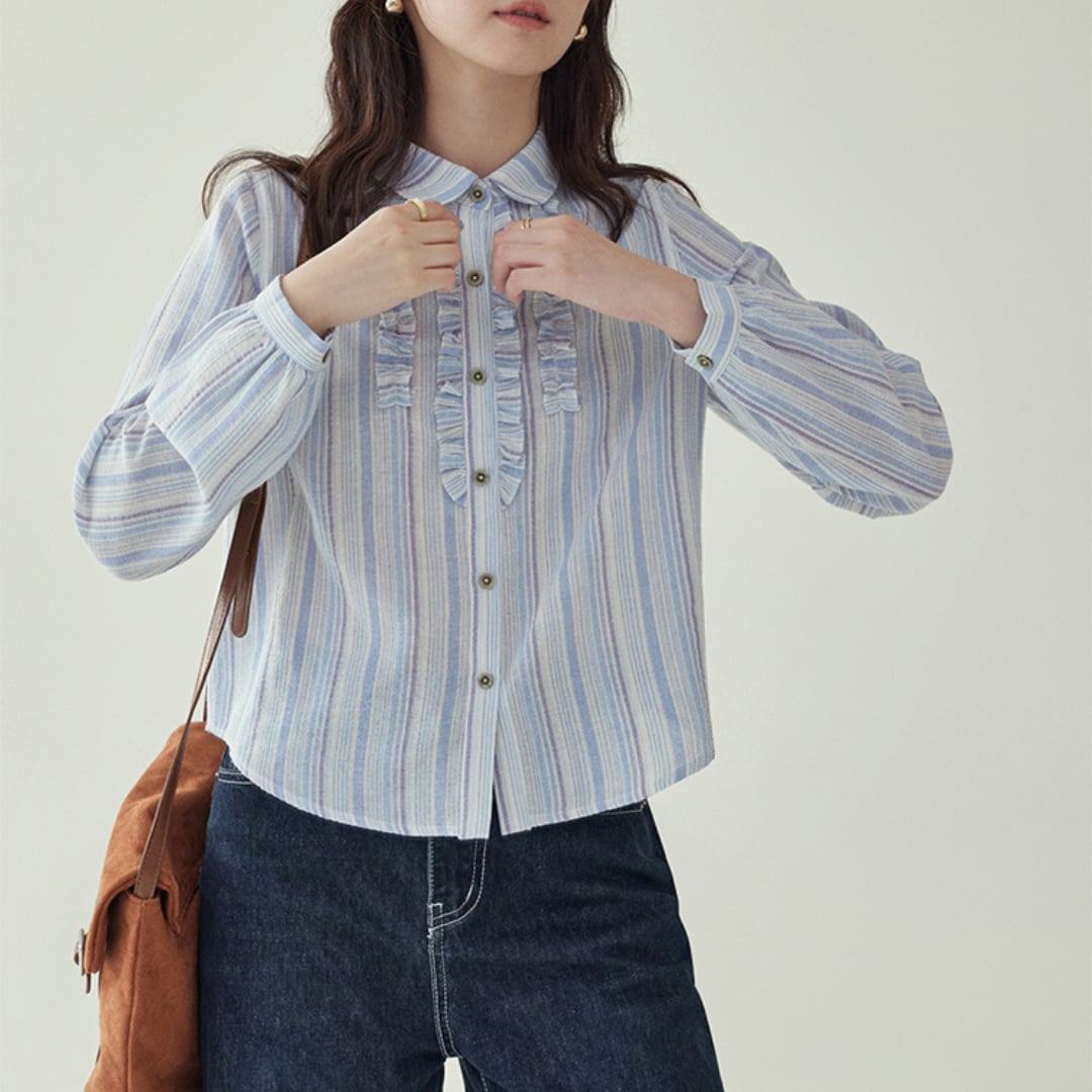 繊細なストライプとフロントのフリルがポイントのシャツブラウス。