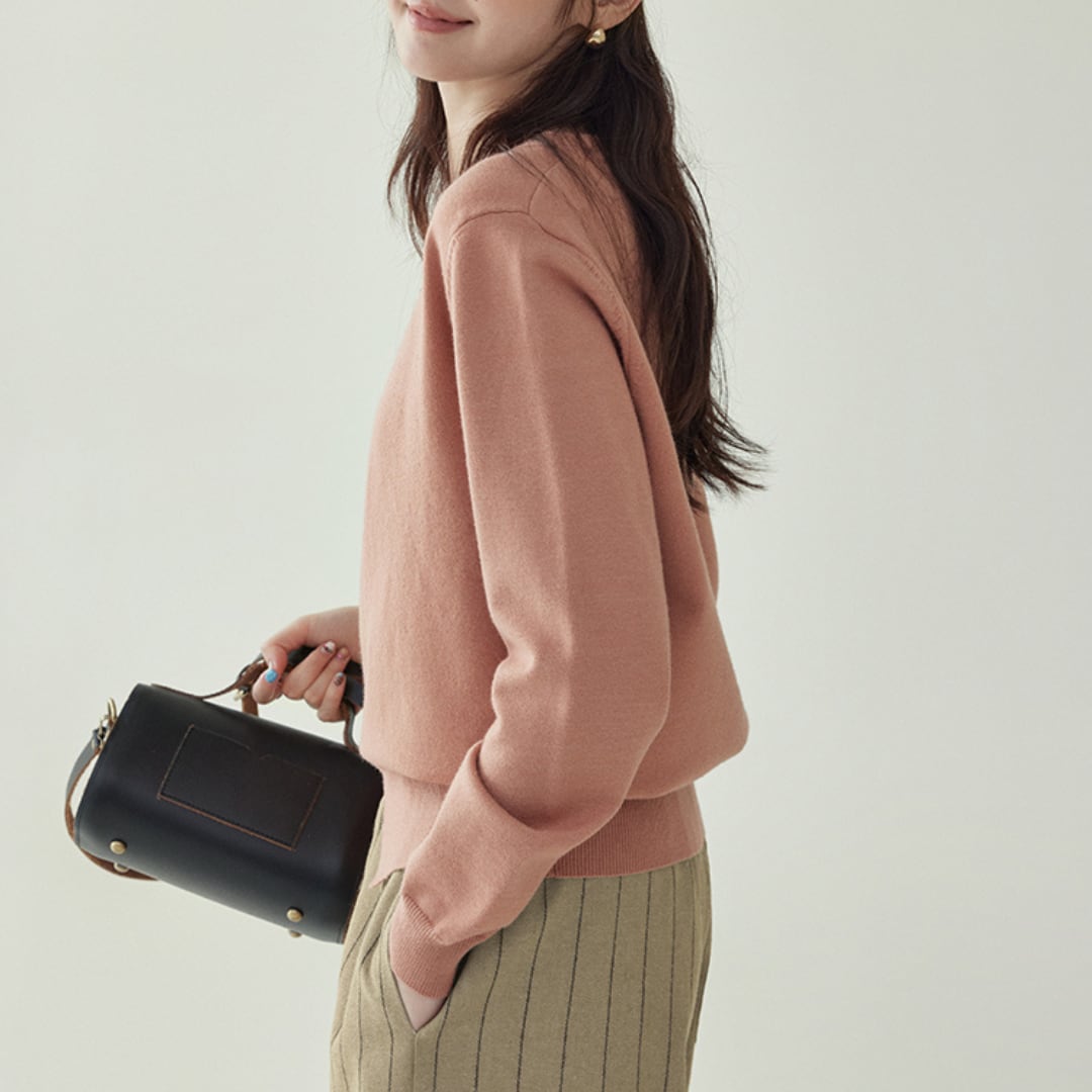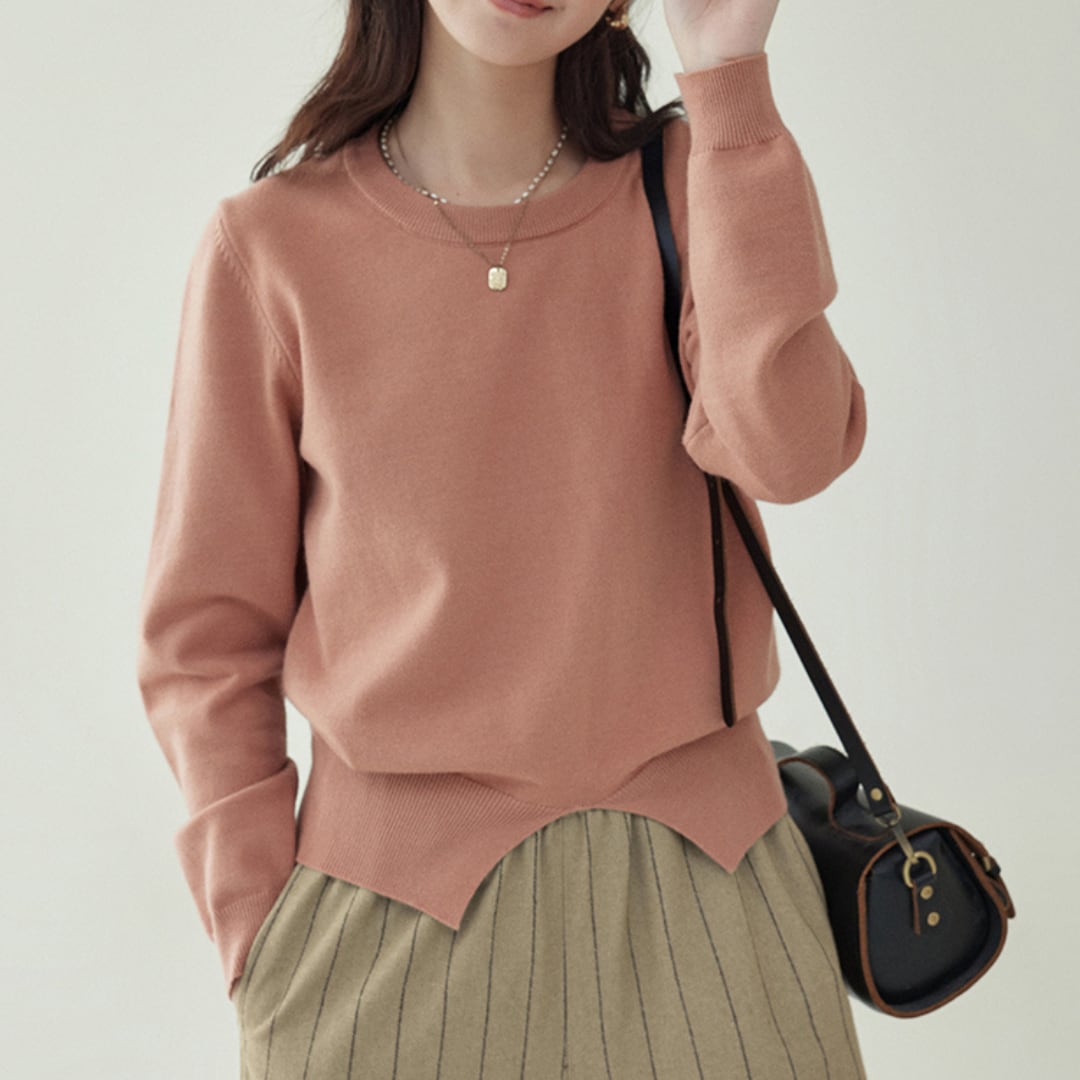 やわらかな風合いとサイドスリットが特徴のクルーネックニットトップス。