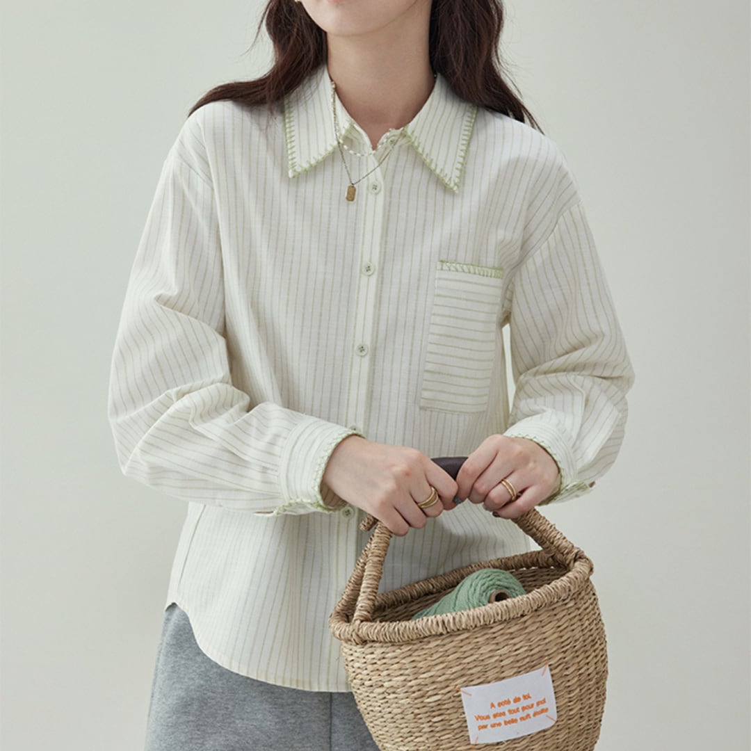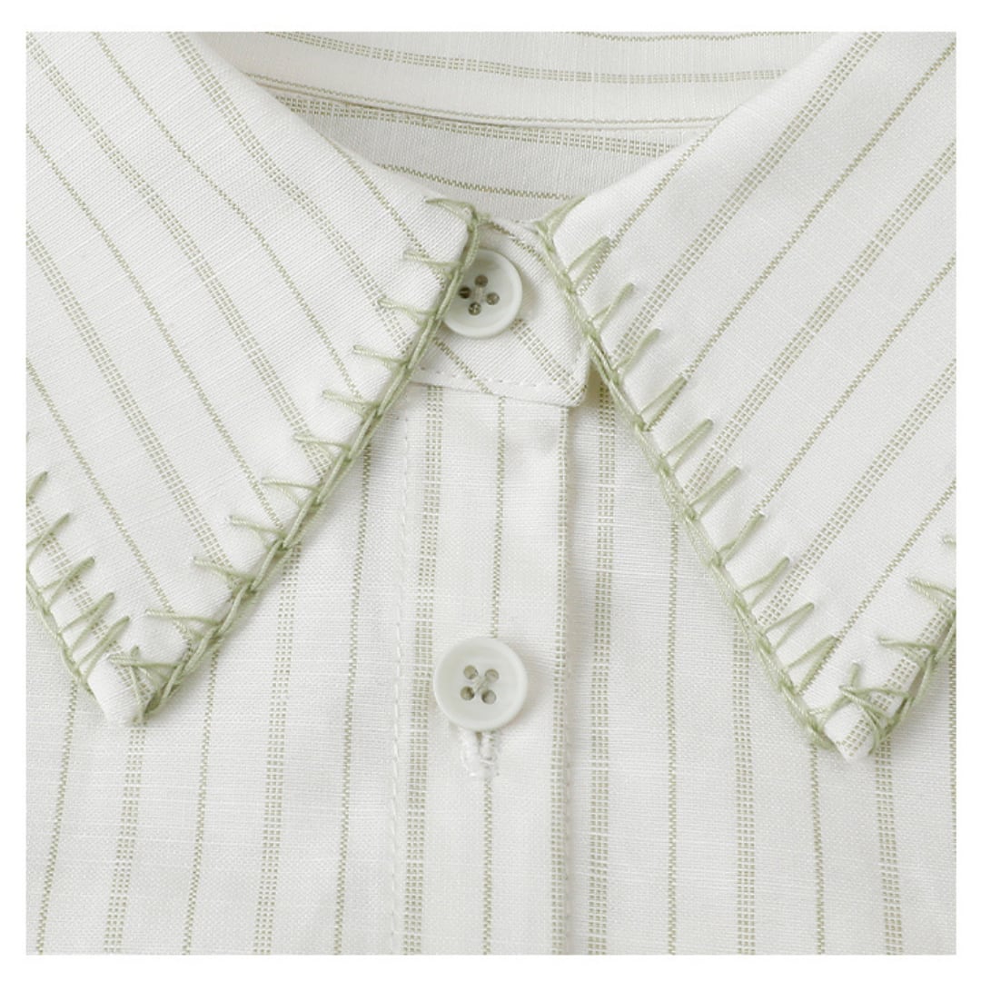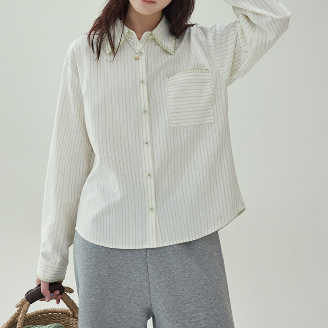 ステッチ風デザインと淡いストライプ柄が特徴の、ナチュラルな印象のシャツ。