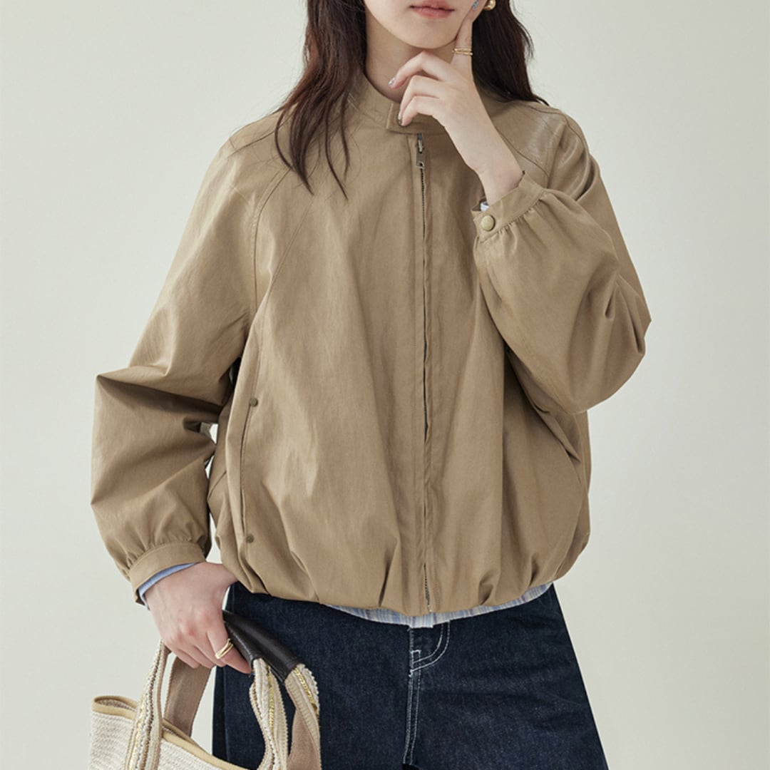 丸みのある裾デザインが女性らしいシルエットを演出するジップアップジャケット。