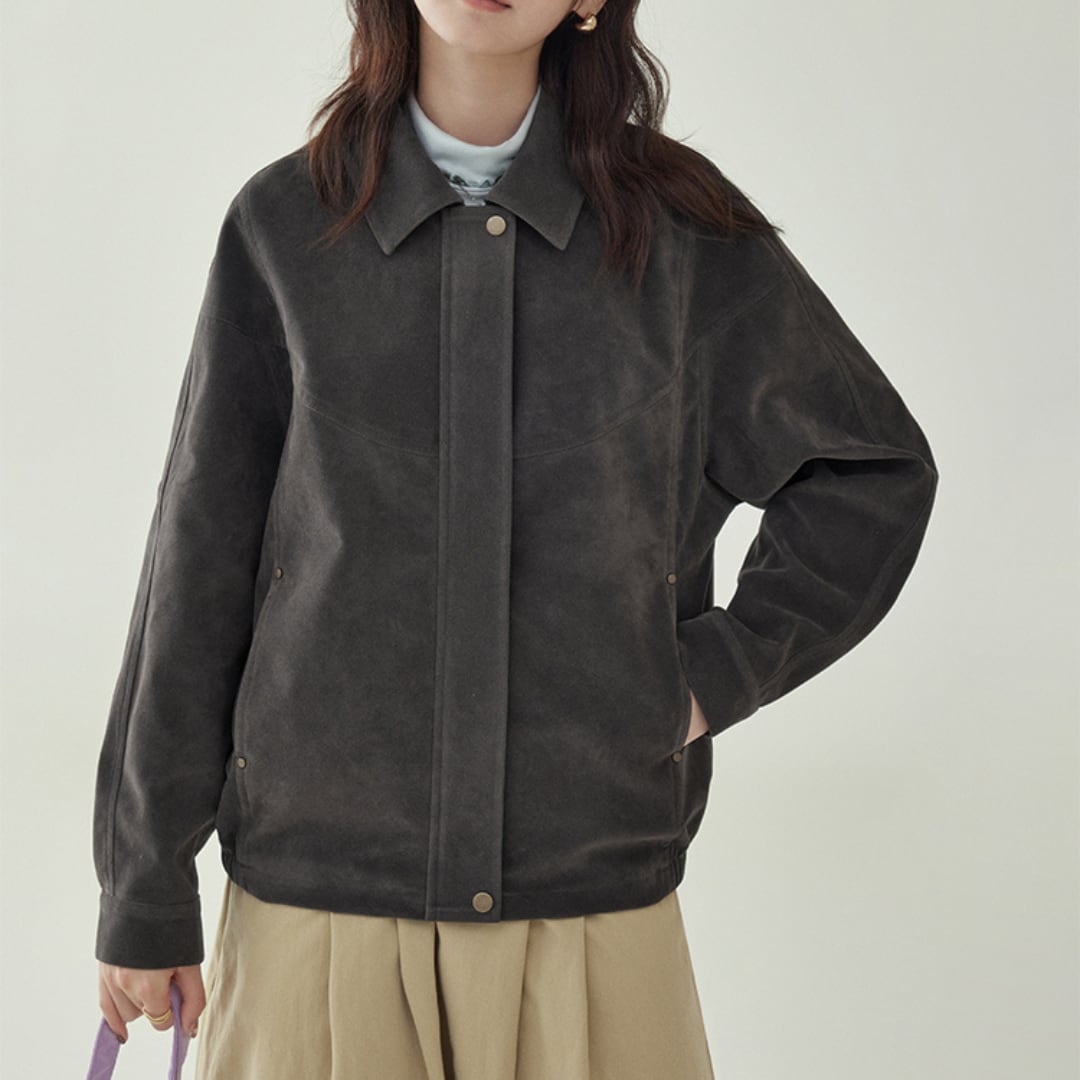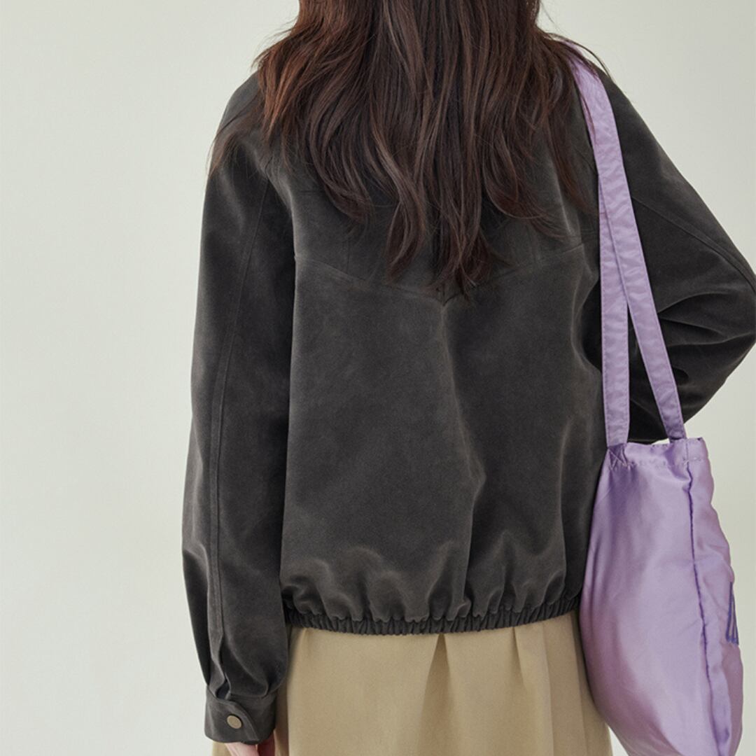 マットな質感とスナップボタンが落ち着いた印象を与えるショート丈ジャケット。