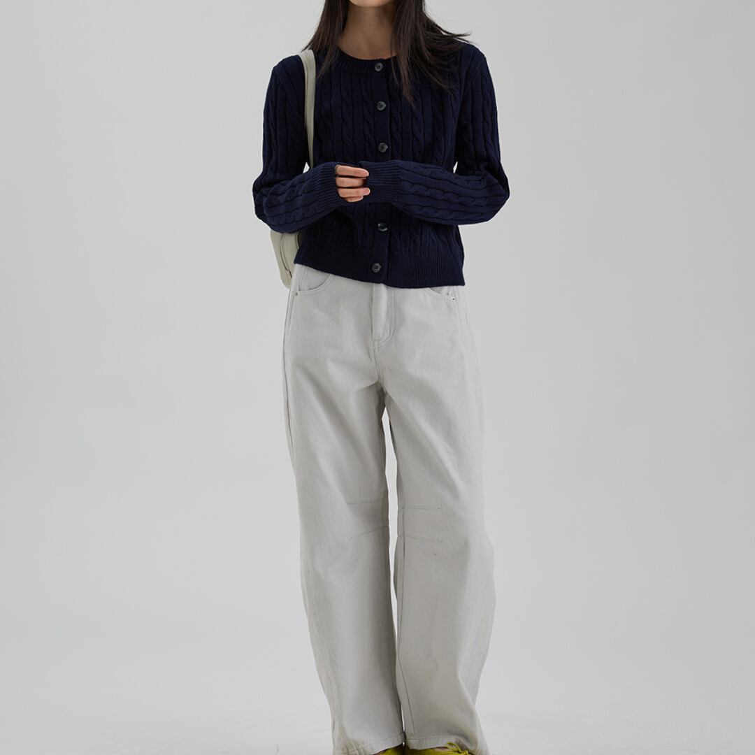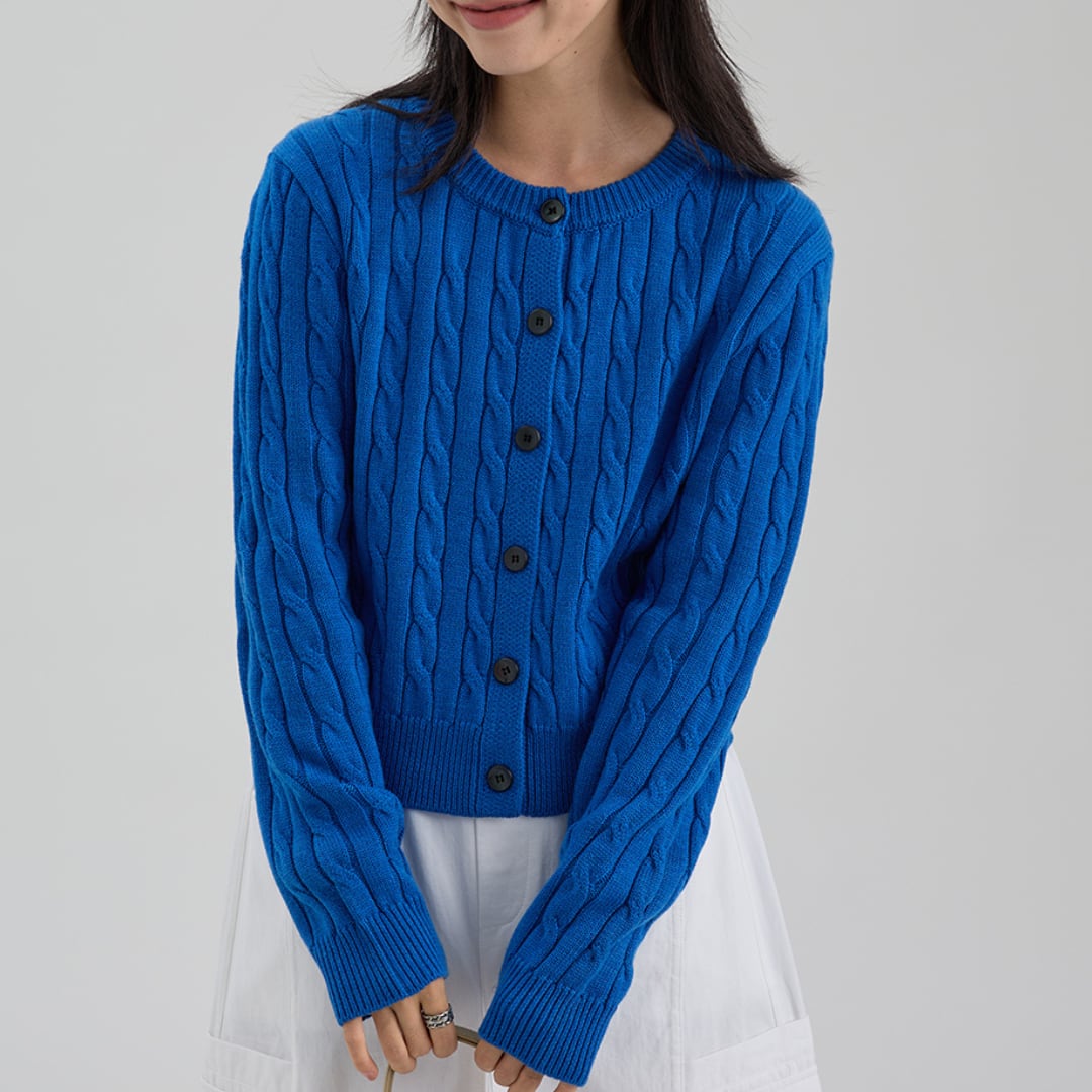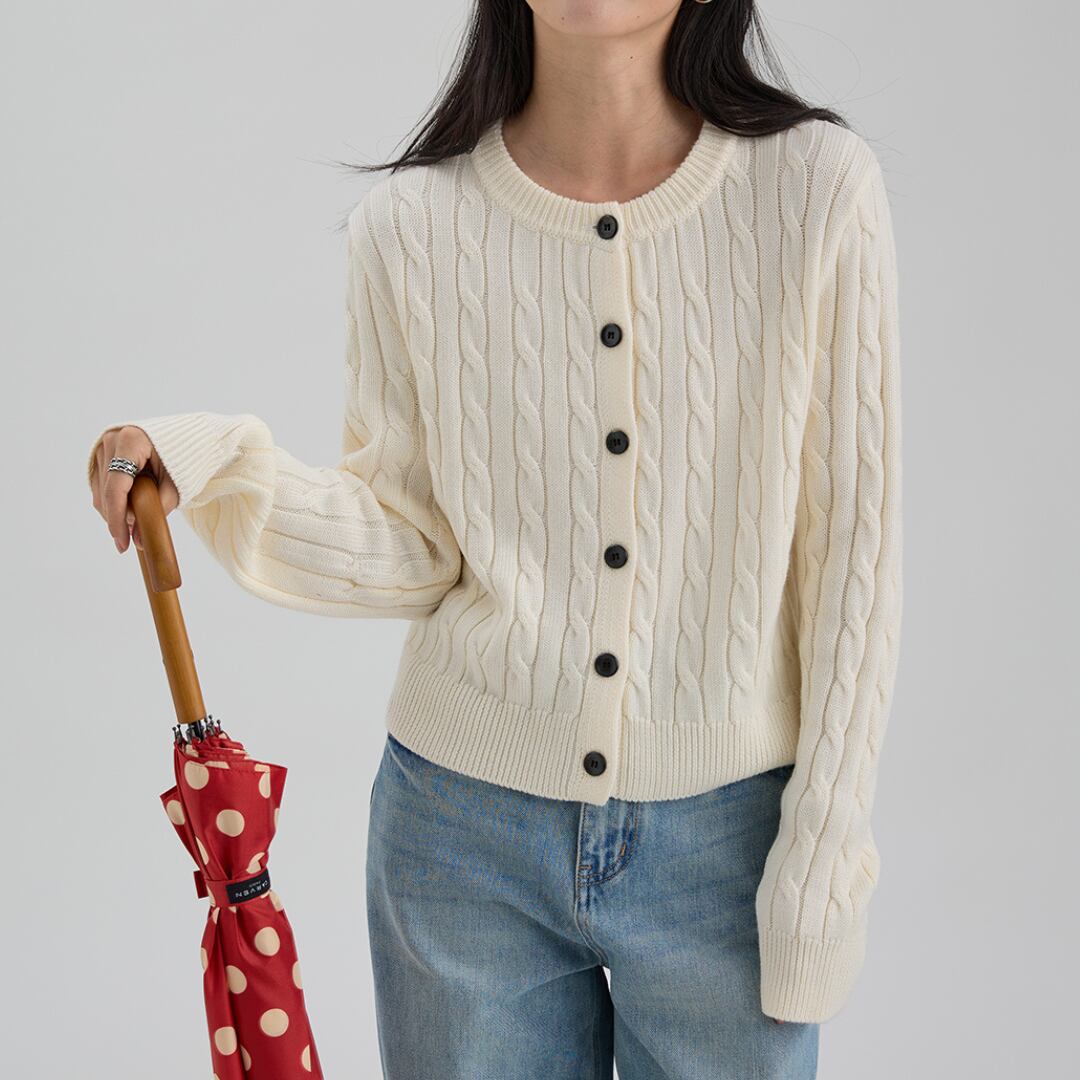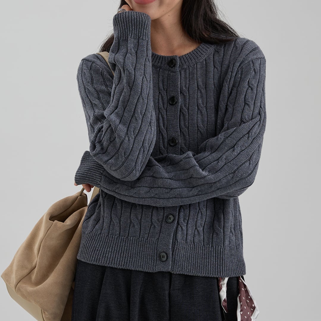 クラシカルなケーブル編みとコントラストボタンが目を引く、コンパクトなシルエットのクルーネックカーディガン。