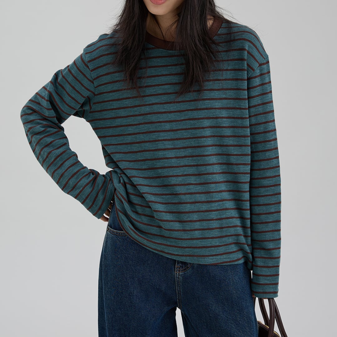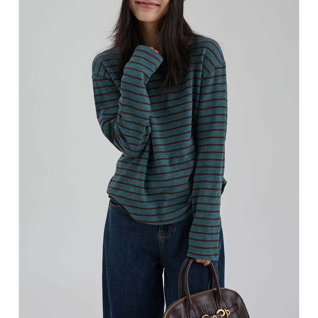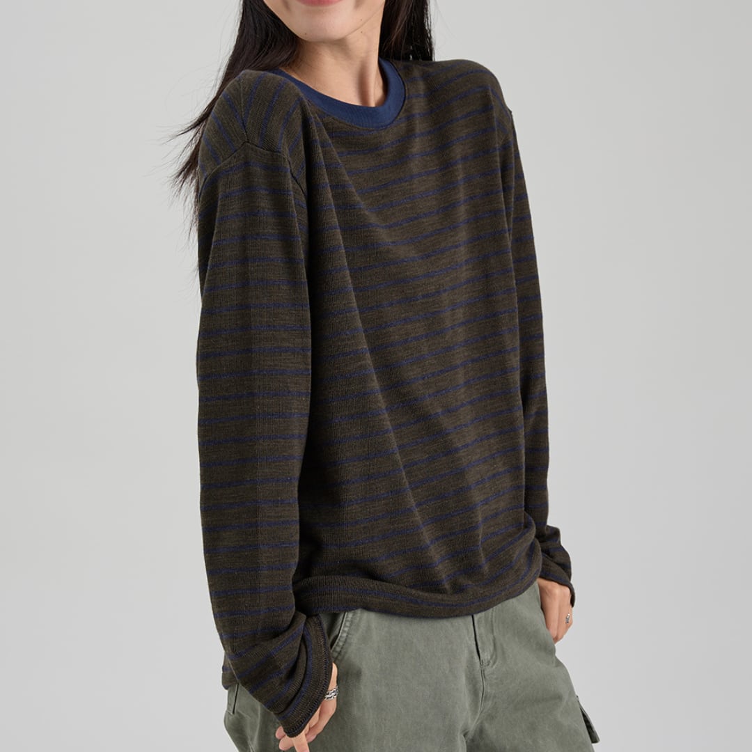柔らかな風合いとレトロなストライプ柄が魅力の、ゆったりシルエットの長袖トップス。