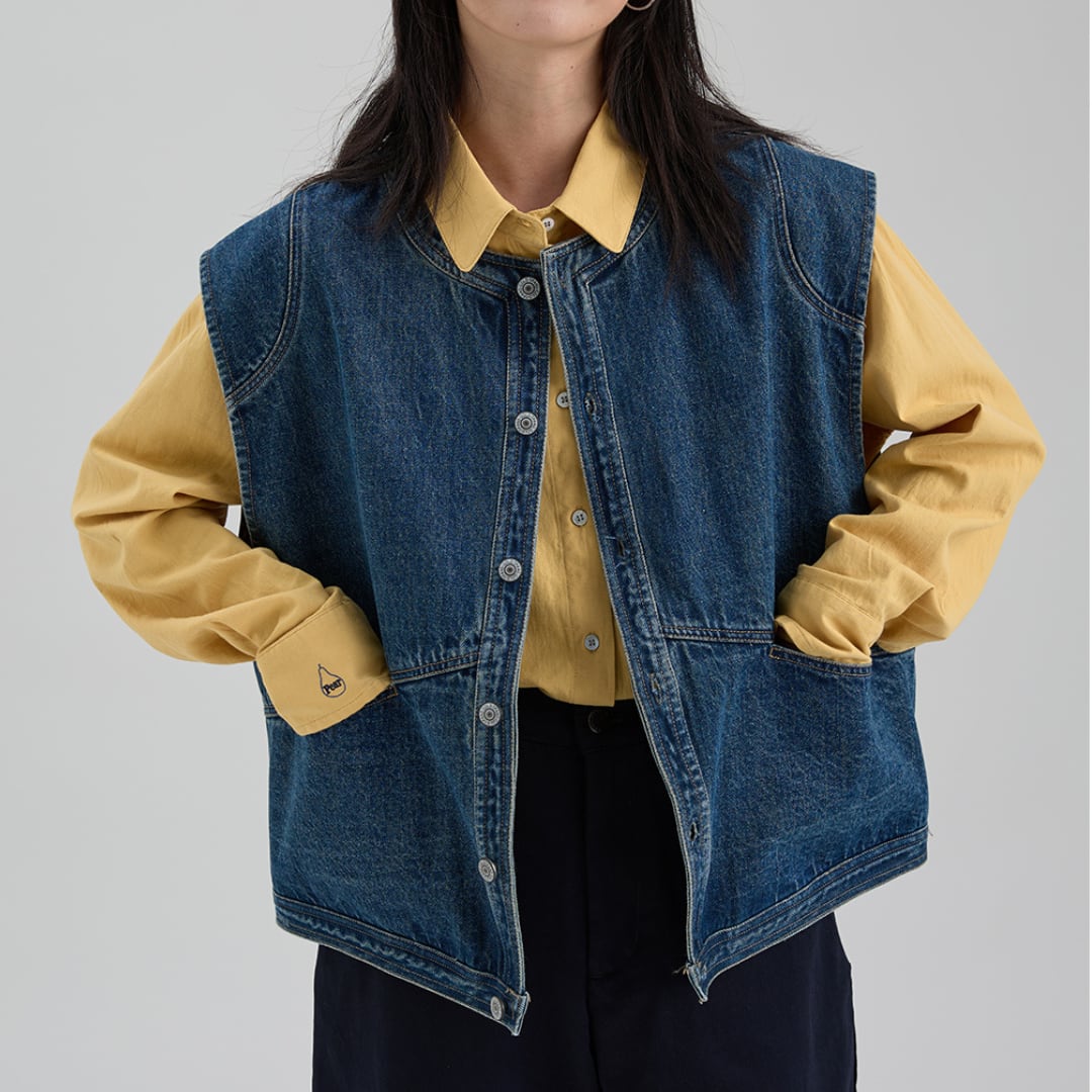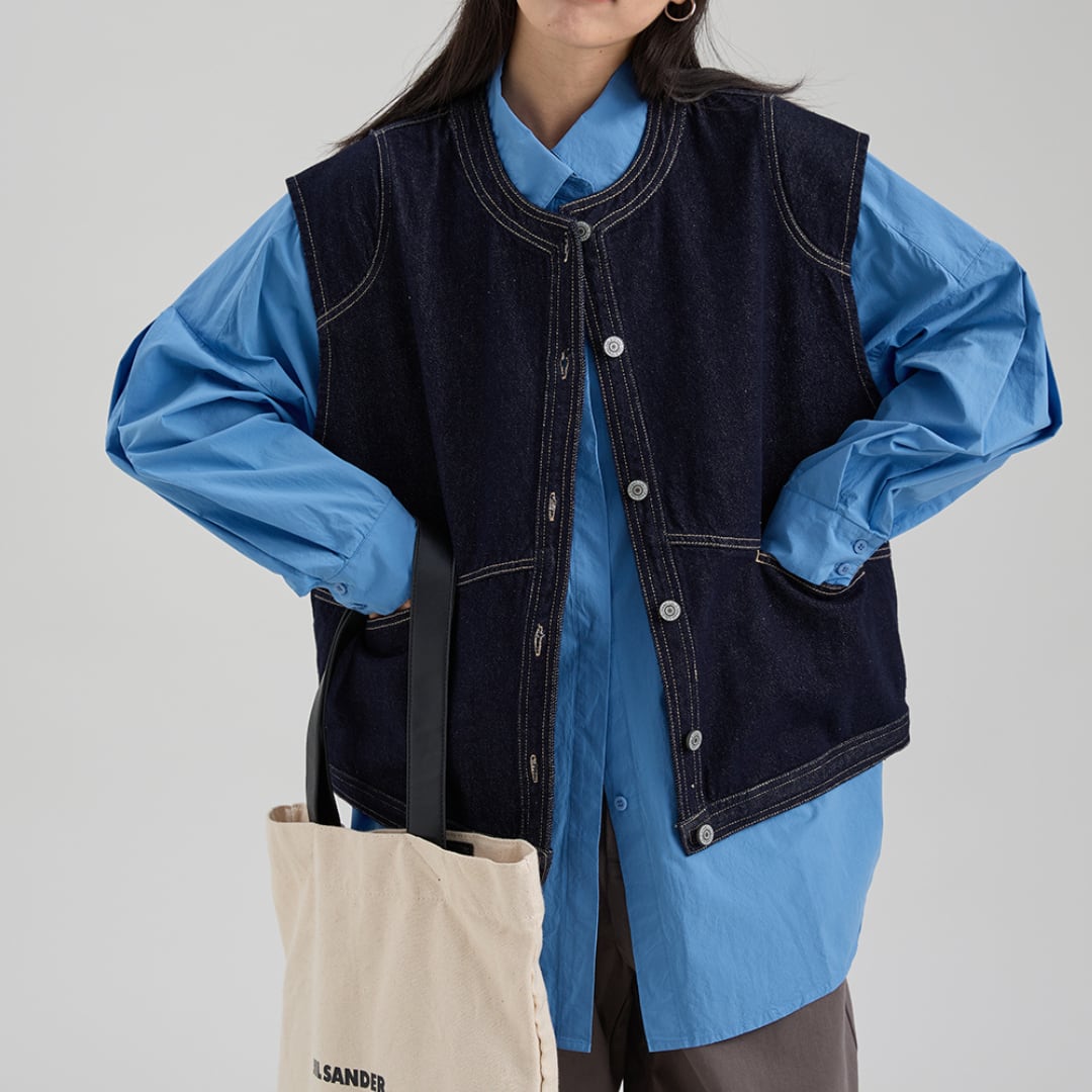 ナチュラルなデニム素材とクラシックなシルエットが魅力のラウンドネックベスト。