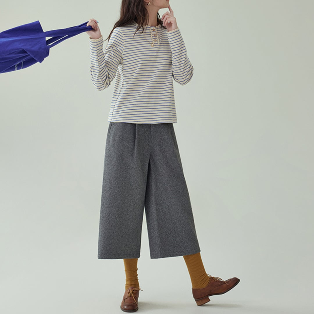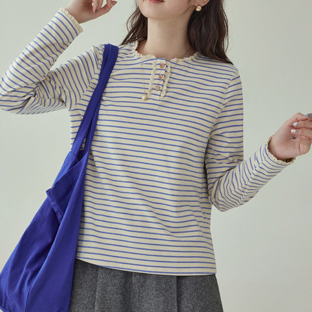 首元のフリルとパール調ボタンがアクセントになった、フェミニンな印象のボーダーカットソー。