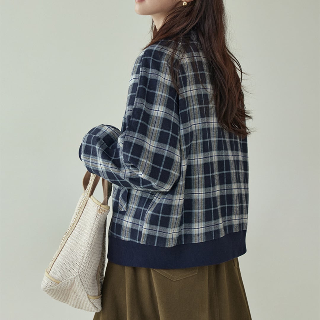 ラグランスリーブとスナップボタンがカジュアルな印象を与える、チェック柄のライトジャケット。