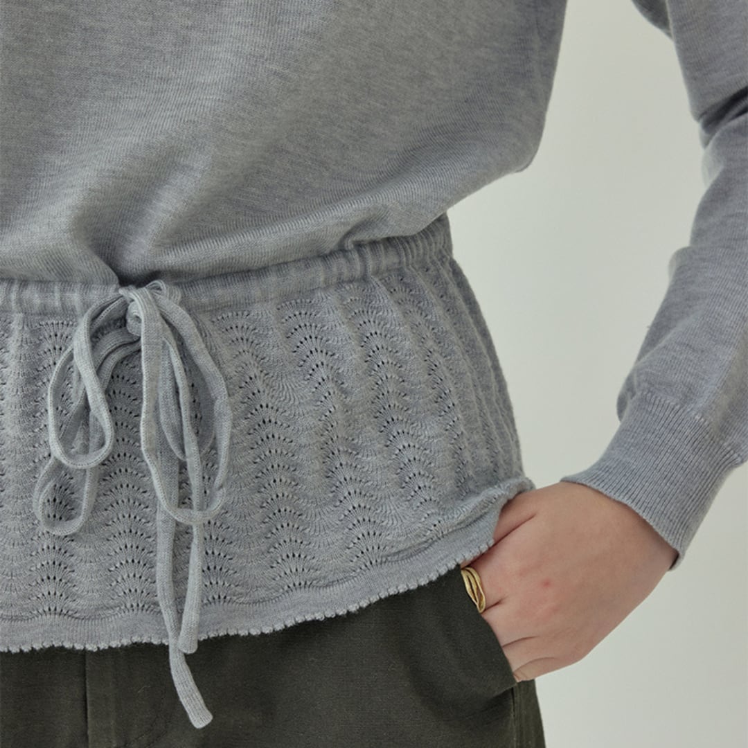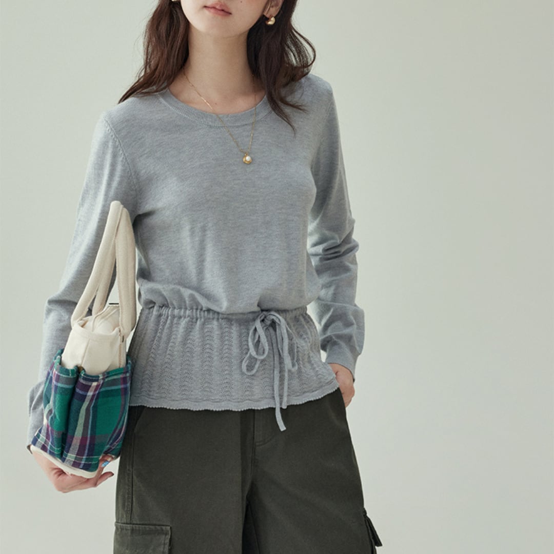 ウエストのドローストリングでシルエットの調整ができる、着心地の良いクルーネックトップス。